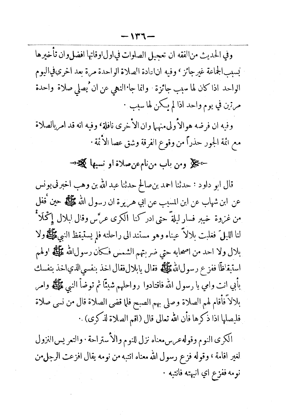 قال أبو داود: حدثنا أحمد بن صالح حدثنا عبد الله بن وهب أخبرني يونس عن ابن شهاب عن ابن المسيب، عَن أبي هريرة أن رسول الله صلى الله عليه وسلم حين قفل من غزوة خيبر فسار ليلة حتى أدركنا الكرى عرَّس وقال لبلال اكلأ لنا الليل فغلبت بلالا عيناه وهو مستند إلى راحلته فلم يستيقظ النبي صلى الله عليه وسلم ولا بلالاً، ولا أحد من أصحابه حتى ضربتهم النشمس فكان رسول الله صلى الله عليه وسلم أولهم استيقاظا ففزع رسول الله صلى الله عليه وسلم فقال: يا بلال فقال أخذ بنفسي الذي أخذ بنفسك بأبي أنت وأمي يا رسول الله فاقتادوا رواحلهم شيئا ثم توضأ النبي صلى الله عليه وسلم وأمر بلالا فأقام لهم الصلاة وصلى بهم الصبح فلما قضى الصلاة قال من نسي صلاة فليصلها إذا ذكرها فإن الله تعالى قال {أقم الصلاة لذكري} [طه: 14] .