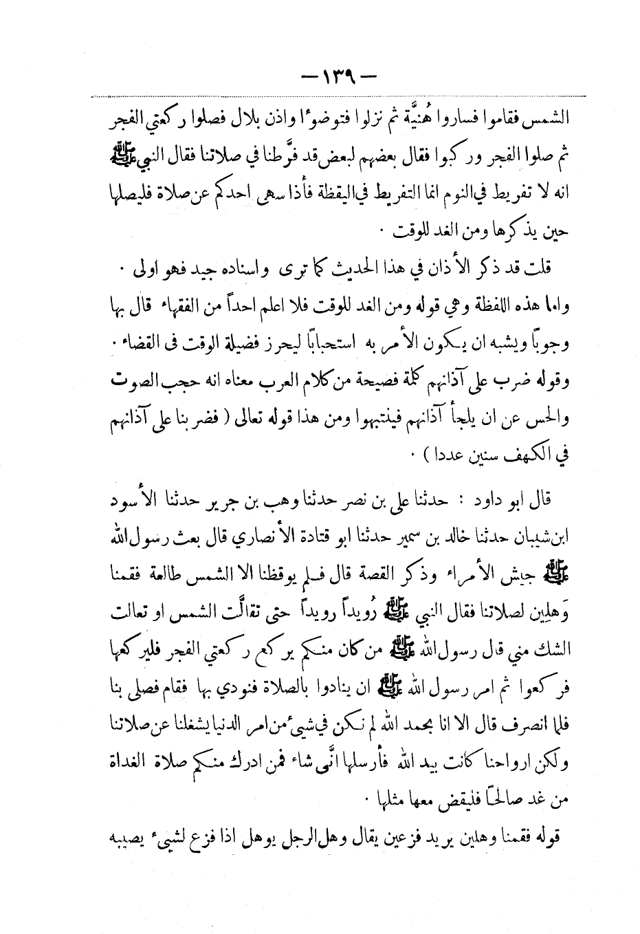 قال أبو داود: حدثنا علي بن نصر حدثنا وهب بن جرير حدثنا الأسود بن شيبان حدثنا خالد بن سمير حدثنا أبو قتادة الأنصاري قال: بعث رسول الله صلى الله عليه وسلم جيش الأمراء وذكر القصة قال فلم يوقظنا إلاّ الشمس طالعة فقمنا وهلين لصلاتنا فقال النبي صلى الله عليه وسلم: رويدا رويدا حتى تقالت الشمس أو تعالت الشك مني قال رسول الله صلى الله عليه وسلم من كان منكم يركع ركعتي الفجر فليركعها فركعوا ثم أمر رسول الله صلى الله عليه وسلم أن ينادوا بالصلاة فنودي بها. فقام فصلى بنا فلما انصرف قال ألا إنا بحمد الله لم نكن في شيء من أمرالدنيا يشغلنا عن صلاتنا ولكن أرواحنا كانت بيد الله فأرسلها أنَّى شاء فمن أدرك منكم صلاة الغداة من غد صالحا فليقض معها مثلها.