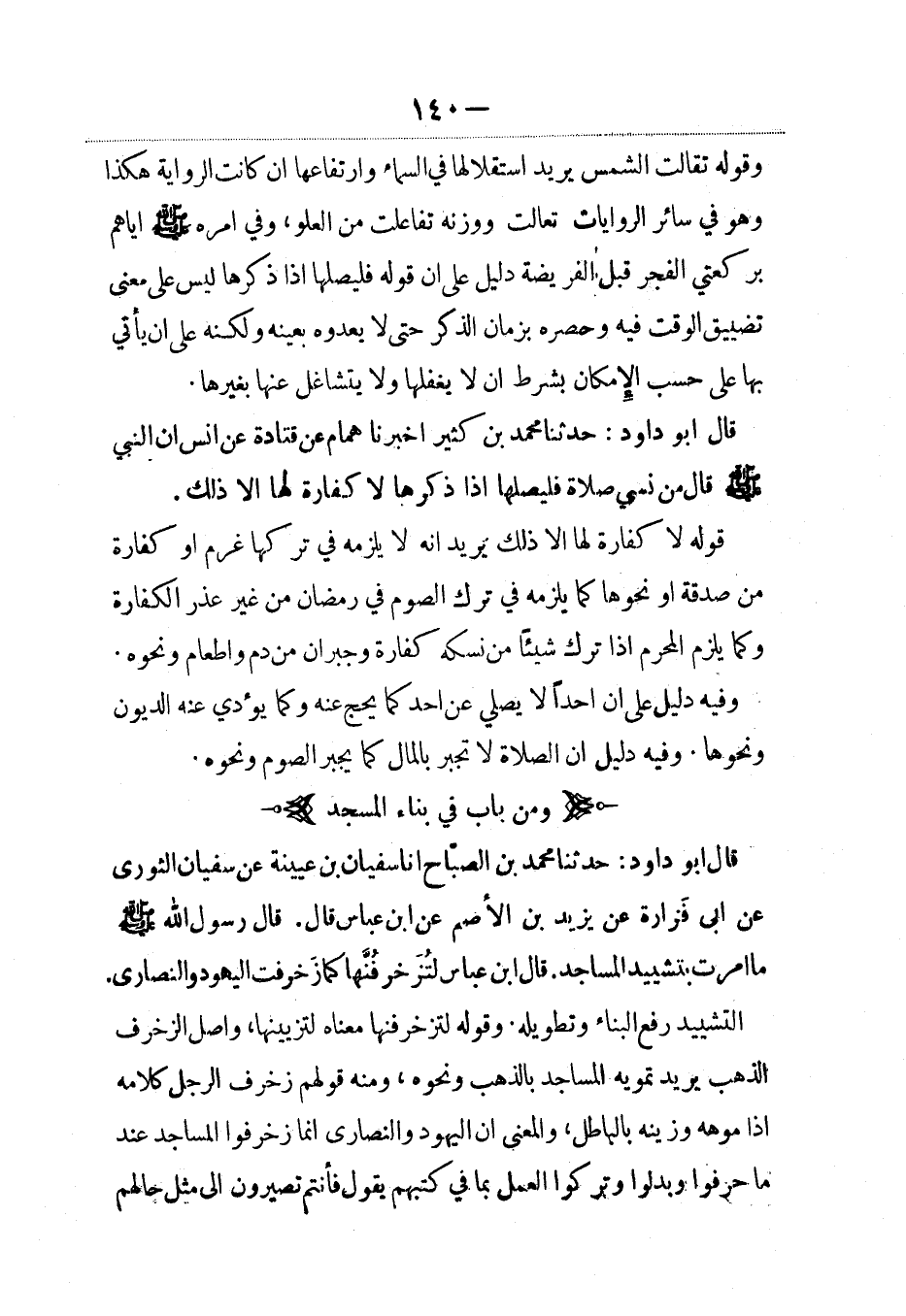 قال أبو داود: حدثنا محمد بن الصباح أنا سفيان بن عيينة عن سفيان الثوري، عَن أبي فزارة عن يزيد بن الأصم عن ابن عباس قال: قال رسول الله صلى الله عليه وسلم: ما أمرت بتشييد المساجد. قال ابن عباس لتُزَخرفُنَّها كما زخرفت اليهود والنصارى.