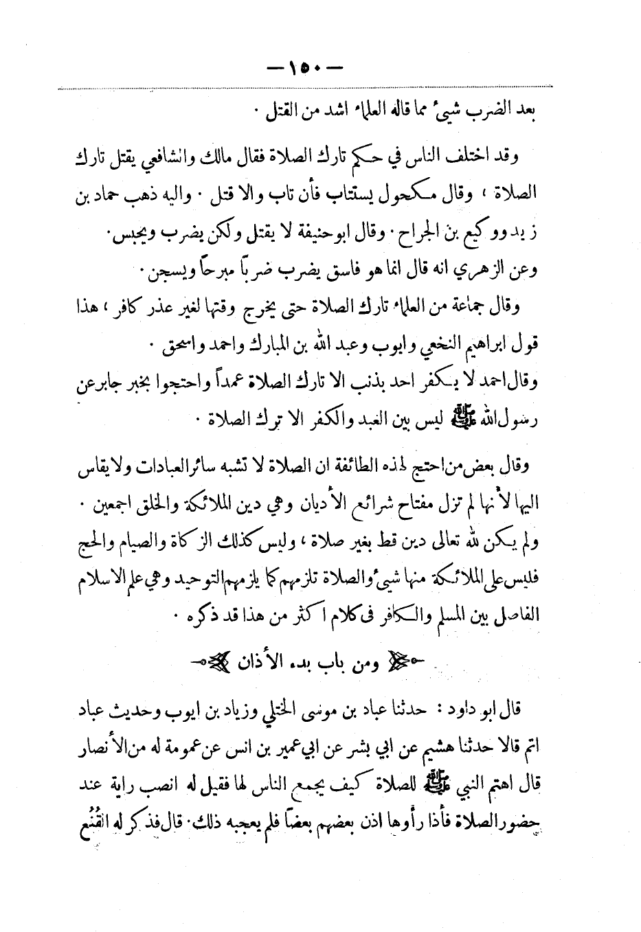 وقد اختلف الناس في حكم تارك الصلاة فقال مالك والشافعي يقتل تارك الصلاة، وقال مكحول يستتاب فإن تاب وإلا قتل. وإليه ذهب حماد بن زيد ووكيع بن الجراح. وقال أبو حنيفة لا يقتل ولكن يضرب ويحبس.