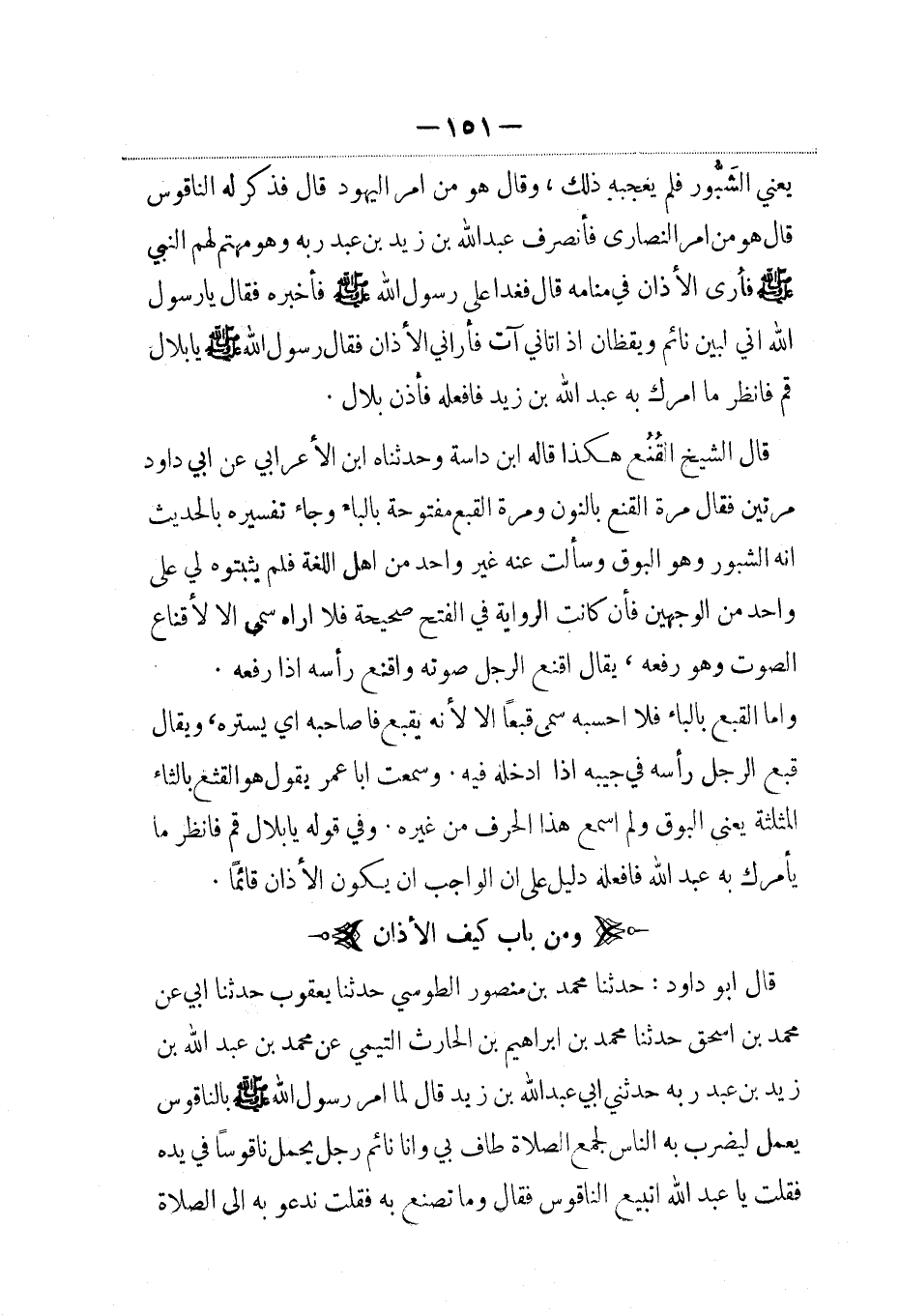 قال أبو داود: حدثنا محمد بن منصور الطوسي حدثنا يعقوب حدثنا أبي عن محمد بن إسحاق حدثنا محمد بن إبراهيم بن الحارث التيمي عن محمد بن عبد الله بن زيد بن عبد ربه حدثنى أبي عبد الله بن زيد قال لما أمر رسول الله ص بالناقوس يعمل ليضرب به الناس لجمع الصلاة طاف بي وأنا نائم رجل يحمل ناقوسا في يده فقلت يا عبد الله اتبيع الناقوس فقال وما تصنع به فقلت ندعو به إلى الصلاة