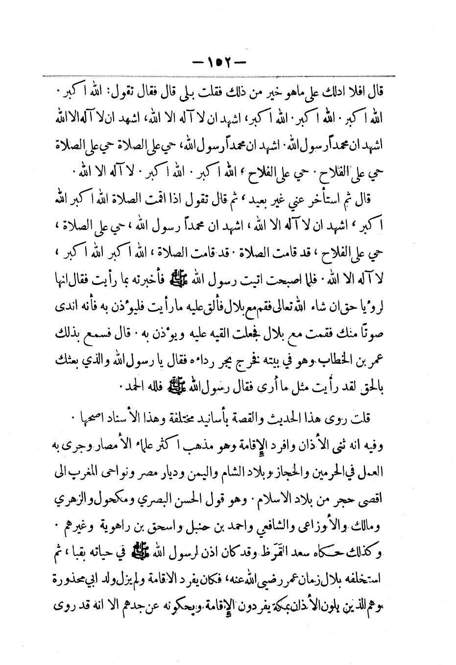 وفيه أنه ثنى الأذان وأفرد الإقامة وهو مذهب أكثر علماء الأمصار وجرى به العمل في الحرمين والحجاز وبلاد الشام واليمن وديار مصر ونواحي المغرب إلى أقصى حجر من بلاد الإسلام. وهو قول الحسن البصري ومكحول والزهري ومالك والأوزاعي والشافعي وأحمد بن حنبل وإسحاق بن راهويه وغيرهم.