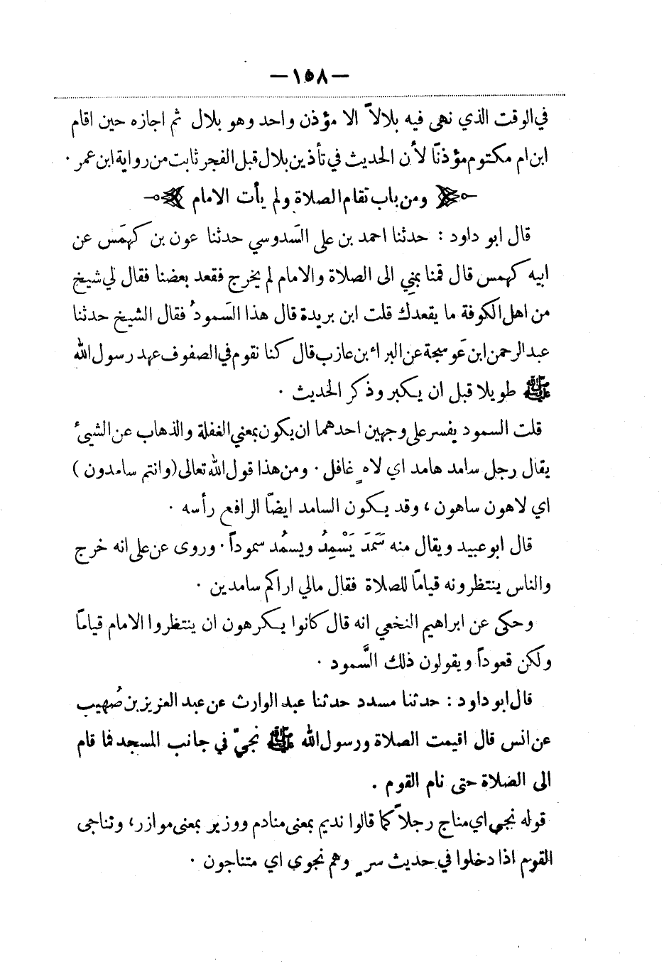 قال أبو داود: حدثنا أحمد بن علي السدوسي حدثنا عون بن كهمس عن أبيه كهمس قال قمنا بمنى إلى الصلاة والإمام لم يخرج فقعد بعضنا فقال لي شيخ من أهل الكوفة ما يقعدك قلت ابن بريدة قال هذا السَمودُ فقال الشيخ حدثنا عبد الرحمن بن عَوسجة عن البراء بن عازب قال كنا نقوم في الصفوف عهد رسول الله صلى الله عليه وسلم طويلا قبل أن يكبر وذكر الحديث.