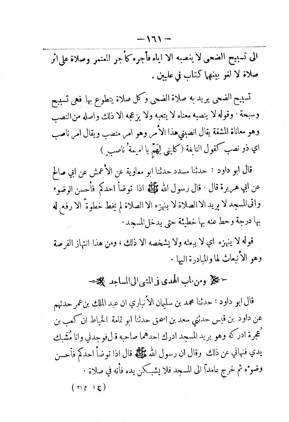 قال أبو داود: حدثنا مسدد حدثنا أبو معاوية عن الأعمش، عَن أبي صالح، عَن أبي هريرة قال قال رسول الله صلى الله عليه وسلم: إذا توضأ أحدكم فأحسن الوضوء وأتى المسجد لا يريد إلاّ الصلاة لا ينهزه إلاّ الصلاة لم يخط خطوة إلاّ رفع له بها درجة وحط عنه بها خطيئة حتى يدخل المسجد.