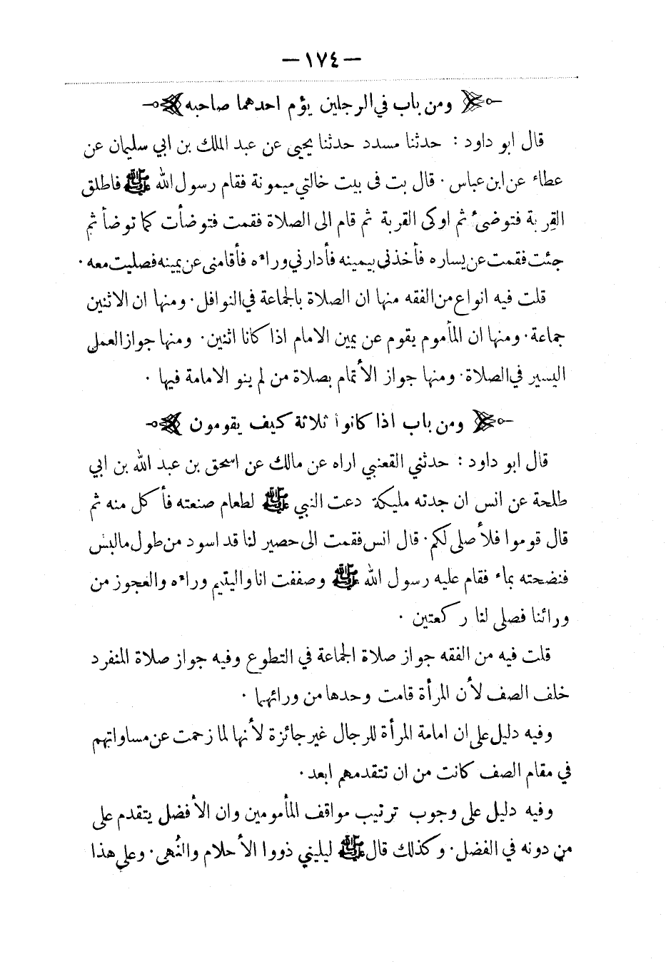 قال أبو داود: حدثنا مسدد حدثنا يحيى عن عبد الملك بن أبي سليمان عن عطاء عن ابن عباس. قال بت في بيت خالتي ميمونة فقام رسول الله صلى الله عليه وسلم فاطلق القِربة فتوضأ ثم أوكى القربة ثم قام إلى الصلاة فقمت فتوضأت كما توضأ ثم جئت فقمت عن يساره فأخذني بيمينه فأدارني وراءه فأقامني عن يمينه فصليت معه.