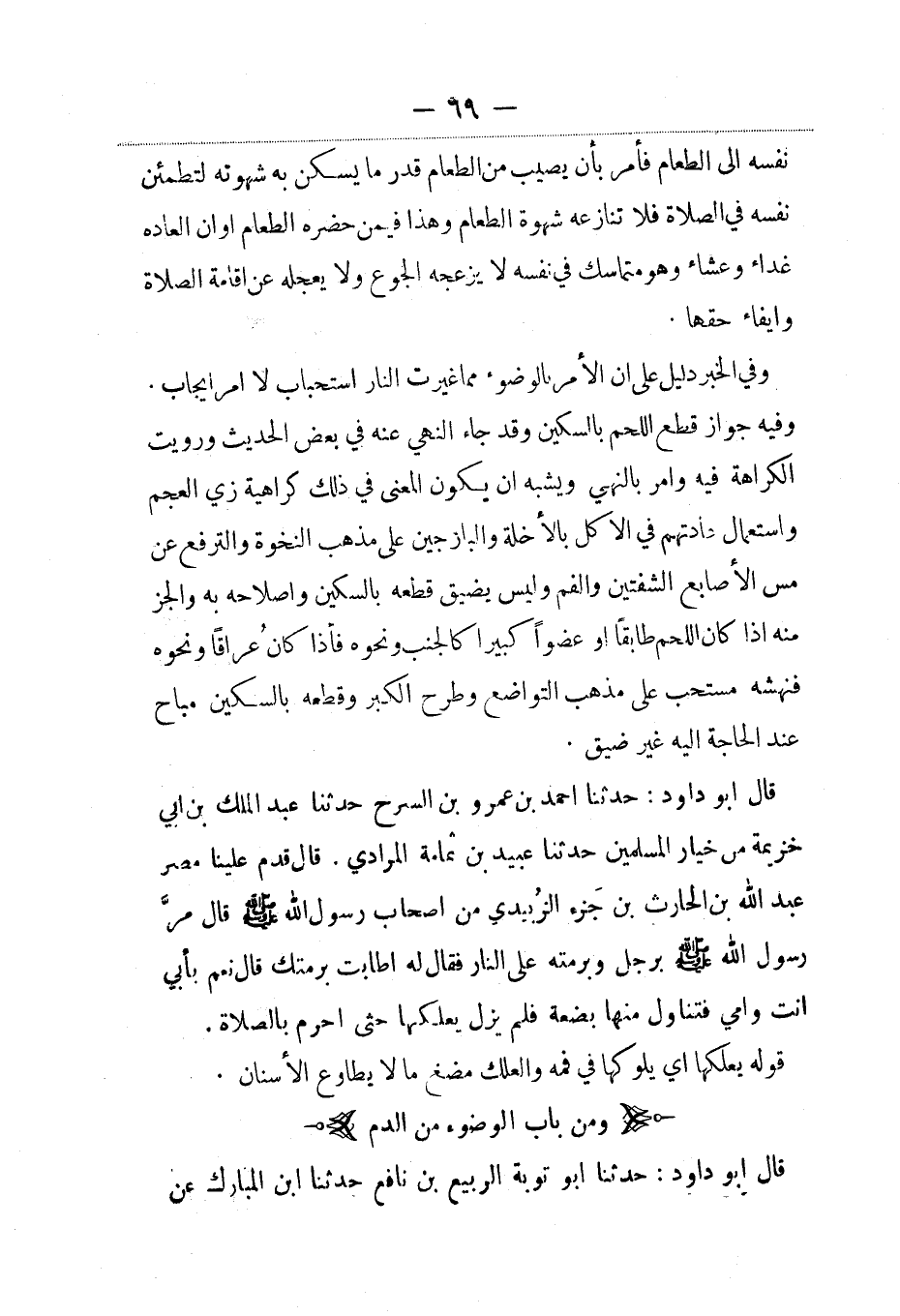 قال أبو داود: حدثنا أحمد بن عمرو بن السرح حدثنا عبد الملك بن أبي كريمة من خيار المسلمين حدثنا عبيدبن ثمامة المرادي. قال قدم علينا مصر عبد الله بن الحارث بن جزء الزُبيدي من أصحاب رسول الله صلى الله عليه وسلم قال مر رسول الله صلى الله عليه وسلم برجل وبرمته على النار فقال له: أطابت برمتك قال نعم بأبي أنت وأمي فتناول منها بضعة فلم يزل يعلكها حتى أحرم بالصلاة.