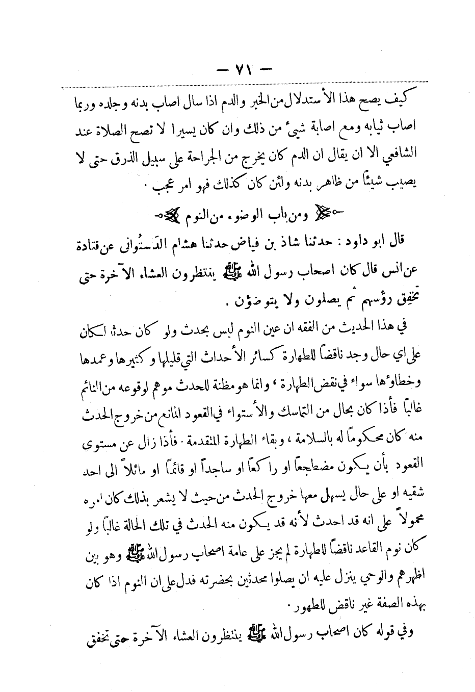 قال أبو داود: حدثنا شاذ بن فياض حدثنا هشام الدستواني عن قتادة عن أنس قال كان أصحاب رسول الله صلى الله عليه وسلم ينتظرون العشاء الآخرة حتى تخفق رؤوسهم ثم يصلون ولا يتوضؤون.