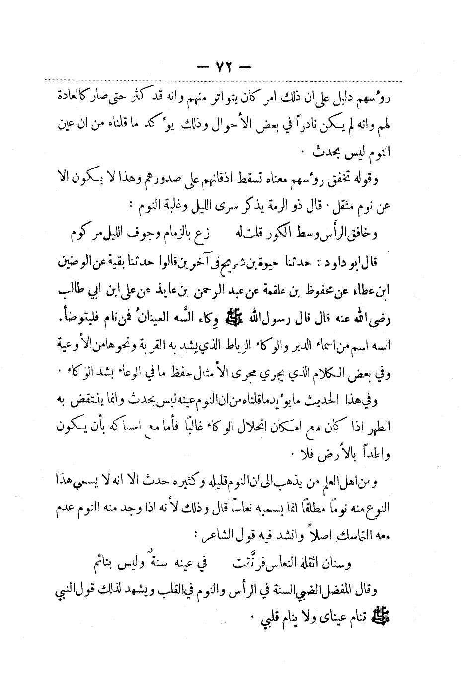 ومن أهل العلم من يذهب إلى أن النوم قليله وكثيره حدث إلاّ أنه لا يسمى هذا النوع منه نوما مطلقا إنما يسميه نعاسا قال وذلك لأنه إذا وجد منه النوم عدم معه التماسك أصلا وأنشد فيه قول الشاعر: