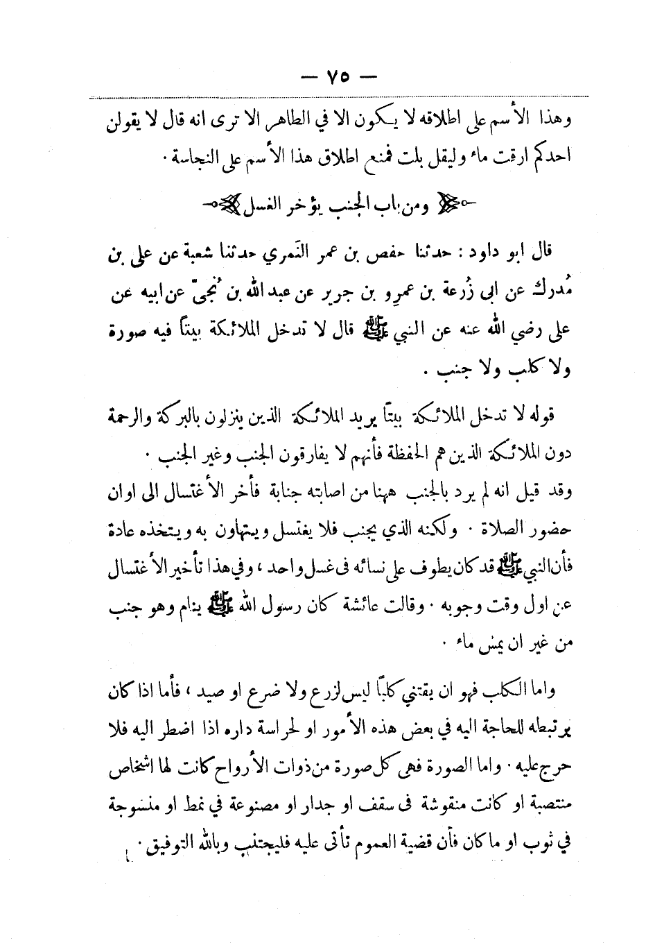 قال أبو داود: حدثنا حفص بن عمر النمري حدثنا شعبة عن علي بن مدرك، عَن أبي زُرعة بن عمرو بن جرير عن عبد الله بن نُجيّ عن أبيه عن علي رضي الله عنه عن النبي صلى الله عليه وسلم قال لا تدخل الملائكة بيتا فيه صورة ولا كلب ولا جنب.