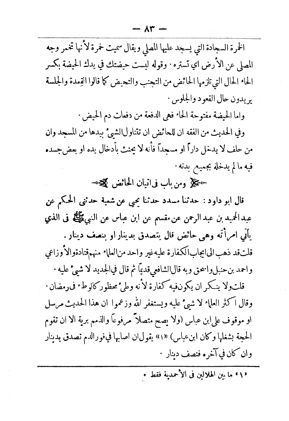قلت ولا ينكر أن يكون فيه كفارة لأنه وطء محظور كالوطء في رمضان وقال أكثر العلماء لا شيء عليه ويستغفر الله وزعموا أن هذا الحديث مرسل أو موقوف على ابن عباس (ولا يصح متصلا مرفوعا والذمم برية إلاّ أن تقوم الحجة بشغلها وكان ابن عباس) يقول إن أصابها في فور الدم تصدق بدينار وإن كان في آخره فنصف دينار.