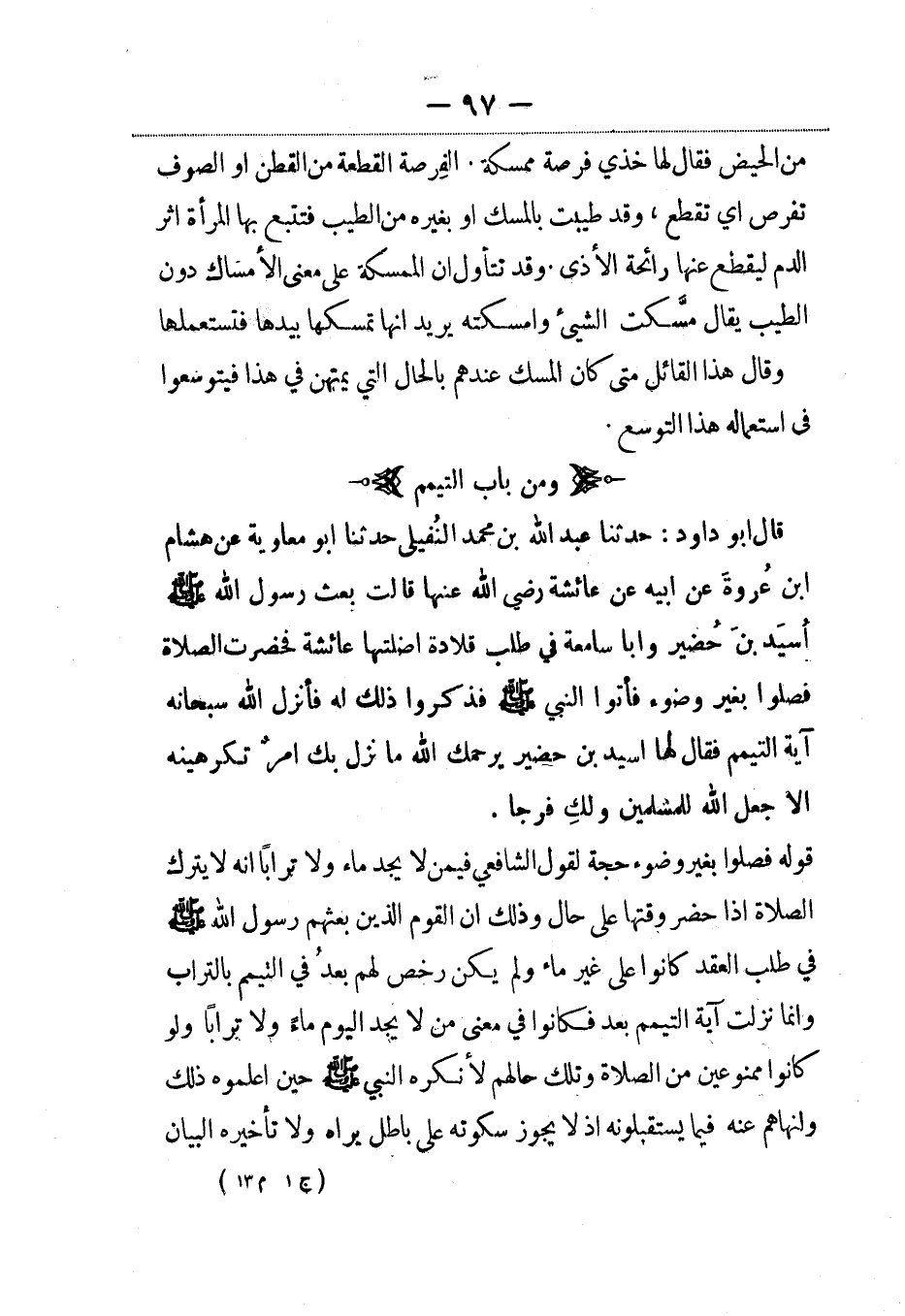 قال أبو داود: حدثنا عبد الله بن محمد النُفيلي حدثنا أبو معاوية عن هشام بن عروة عن أبيه عن عائشة رضي الله عنها قالت بعث رسول الله صلى الله عليه وسلم أُسيَد بن حُضير وأبا سامعة في طلب قلادة أضلتها عائشة فحضرت الصلاة فصلوا بغير وضوء فأتوا النبي صلى الله عليه وسلم فذكروا ذلك له فأنزل الله سبحانه آية التيمم فقال لها أسيد بن حضير يرحمك الله ما نزل بك امرٌ تكرهينه إلاّ جعل الله للمسلمين ولكِ فرجا.