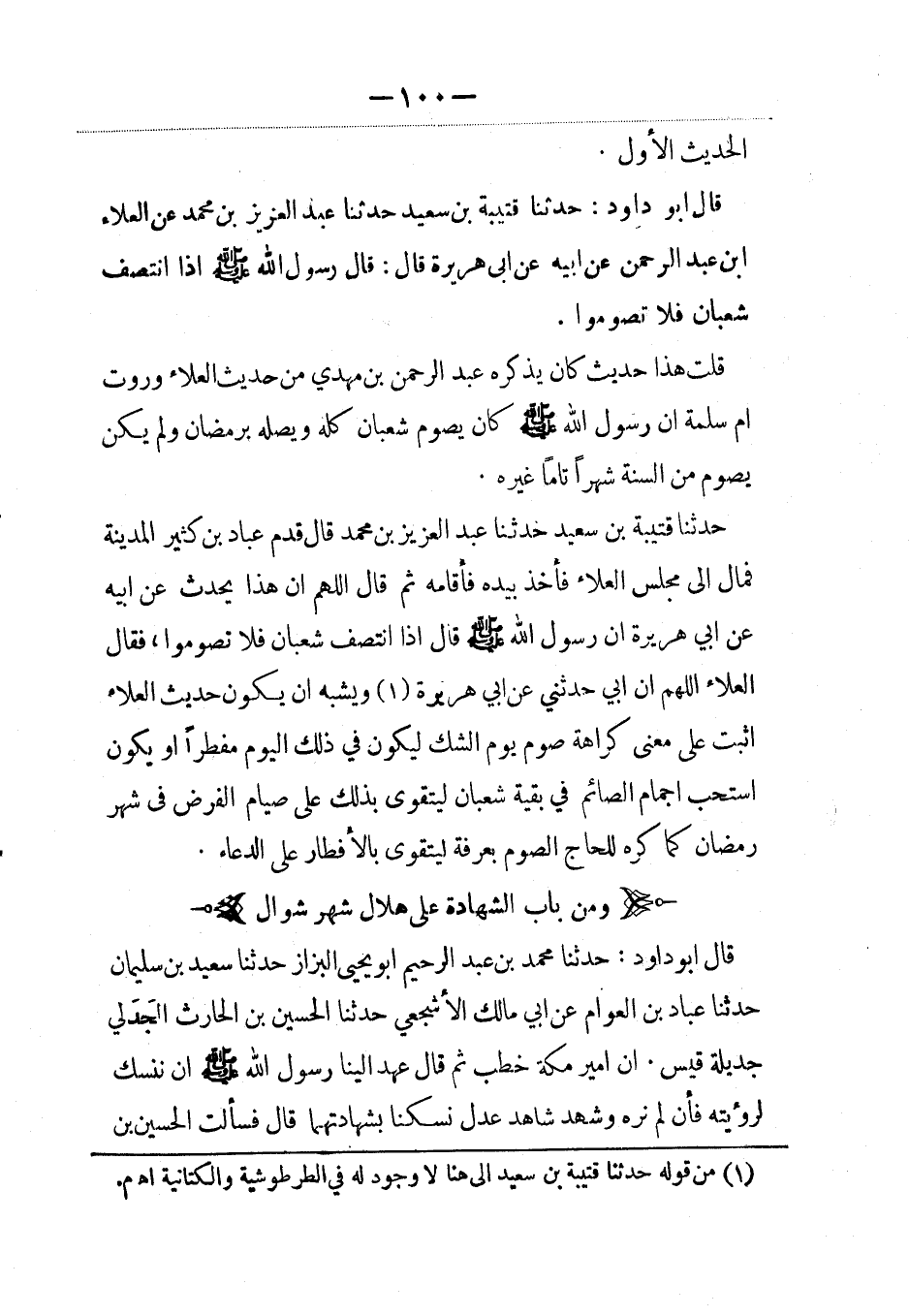 قال أبو داود: حدثنا قتيبة بن سعيد حدثنا عبد العزيز بن محمد عن العلاء بن عبد الرحمن عن أبيه، عَن أبي هريرة قال: قال رسول الله صلى الله عليه وسلم إذا انتصف شعبان فلا تصوموا.