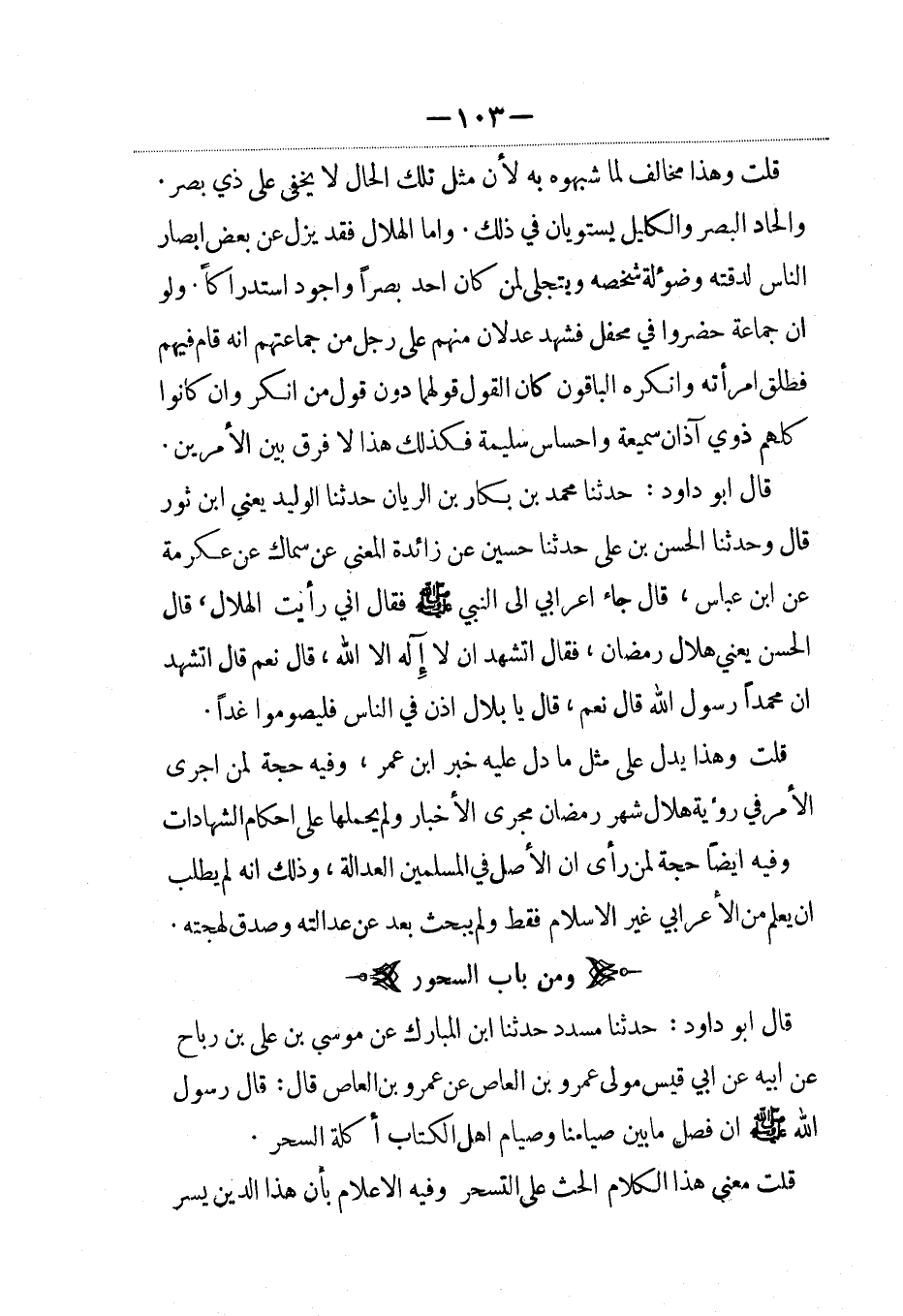 قال أبو داود: حدثنا محمد بن بكار بن الريان حدثنا الوليد، يَعني ابن ثور قال وحدثنا الحسن بن علي حدثنا حسين عن زائدة المعنى عن سماك عن عكرمة عن ابن عباس، قال جاء أعرابي إلى النبي صلى الله عليه وسلم فقال إني رأيت الهلال، قال الحسن، يَعني هلال رمضان، فقال أتشهد أن لا إله إلاّ الله، قال نعم قال أتشهد أن محمداً رسول الله قال نعم، قال يا بلال أذن في الناس فليصوموا غدا.