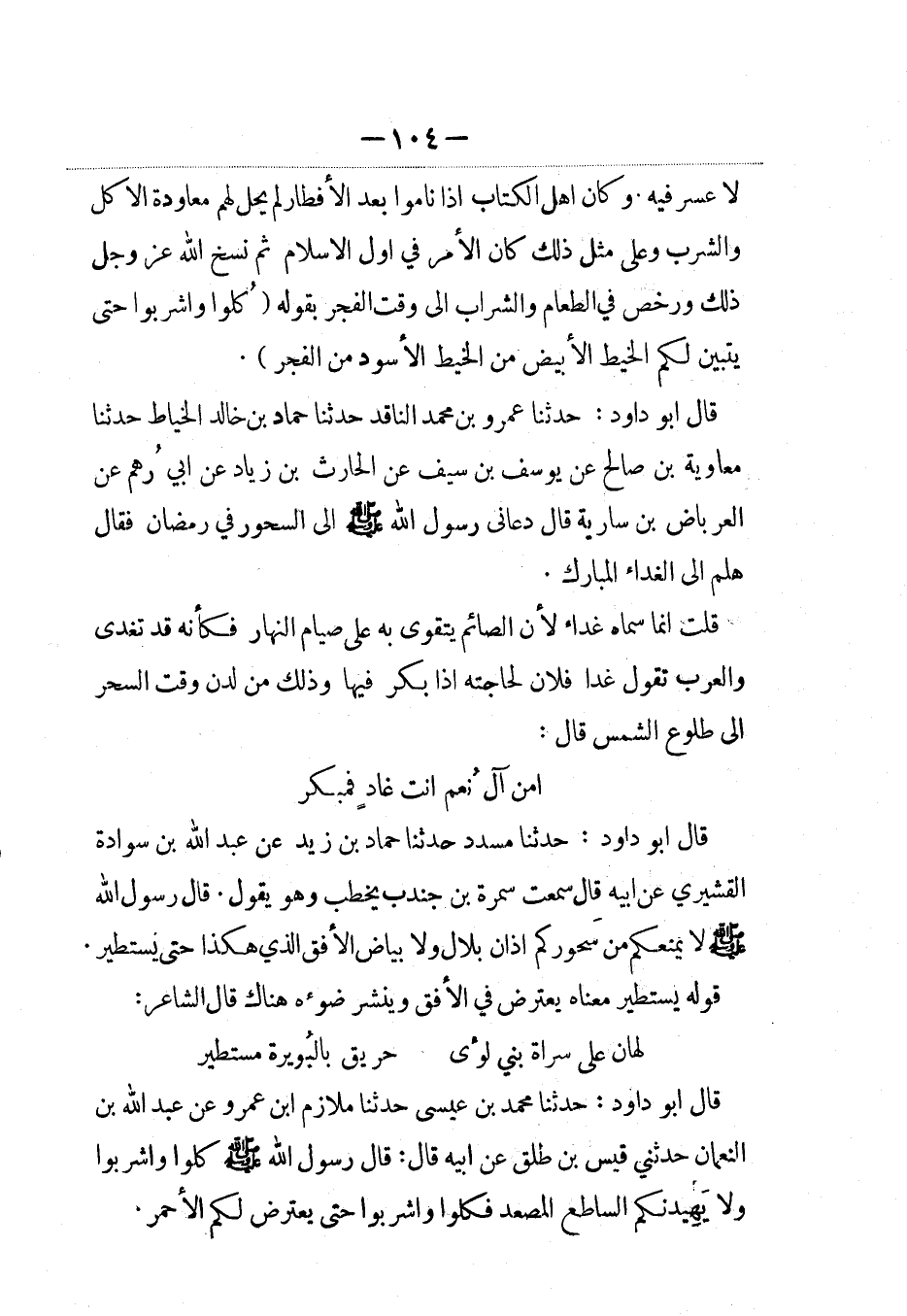 قال أبو داود: حدثنا مسدد حدثنا حماد بن زيد عن عبد الله بن سوادة القشيري عن أبيه قال سمعت سمرة بن جندب يخطب وهو يقول. قال رسول الله صلى الله عليه وسلم: لا يمنعكم من سحوركم أذان بلال ولا بياض الأفق الذي هكذا حتى يستطير.