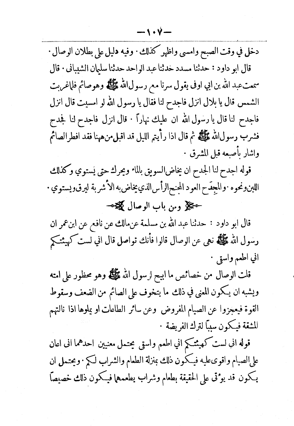قال أبو داود: حدثنا عبد الله بن مسلمة عن مالك عن نافع عن ابن عمر أن رسول الله صلى الله عليه وسلم نهى عن الوصال قالوا فإنك تواصل قال إني لست كهيئتكم أني أطعم وأسقى.