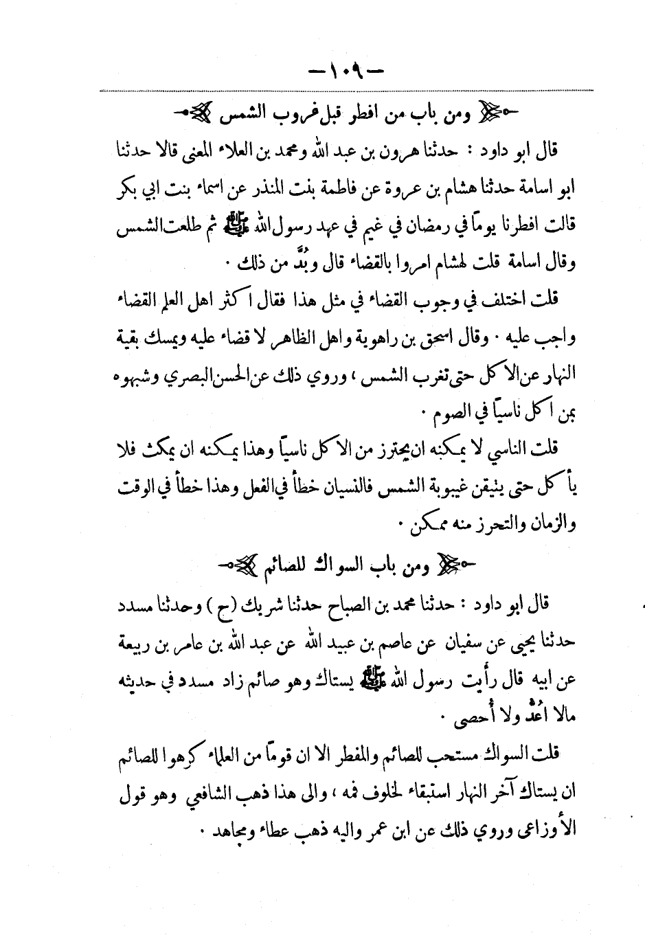 قال أبو داود: حدثنا محمد بن الصباح حدثنا شريك (ح) وحدثنا مسدد حدثنا يحيى عن سفيان عن عاصم بن عبيد الله بن عامر بن ربيعة عن أبيه قال رأيت رسول الله صلى الله عليه وسلم يستاك وهو صائم زاد مسدد في حديثه ما لا أعُدُ ولا أُحصي.