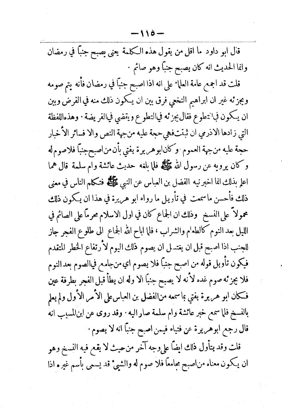 قلت قد أجمع عامة العلماء على أنه إذا أصبح جنبا في رمضان فإنه يتم صومه ويجزئه غير أن إبراهيم النخعي فرق بين أن يكون ذلك منه في الفرض وبين أن يكون في التطوع فقال يجزئه في التطوع ويقضي في الفريضة. وهذه اللفظة التي زادها الأذرمي إن ثبتت فهي حجة عليه من جهة النص وإلا فسائر الأخبار حجة عليه من جهة العموم وكان أبوهريرة يفتي بأن من أصبح جنبا فلا صوم له وكان يرويه عن رسول الله صلى الله عليه وسلم فلما بلغه حديث عائشة وأم سلمة قال هما أعلم بذلك إنما أخبرنيه الفضل بن العباس عن النبي صلى الله عليه وسلم فتكلم الناس في معنى ذلك فأحسن ما سمعت في تأويل ما رواه أبو هريرة في هذا أن يكون ذلك محمولا على النسخ وذلك أن الجماع كان في أول الإسلام محرما على الصائم في الليل بعد النوم كالطعام والشراب، فلما أباح الله الجماع إلى طلوع الفجر جاز للجنب إذا أصبح قبل أن يغتسل أن يصوم ذلك اليوم لارتفاع الخطر المتقدم فيكون تأويل قول من أصبح جنبا فلا يصوم أي من جامع في الصوم بعد النوم فلا يجزئه صوم غده لأنه لا يصبح جنبا إلاّ وله أن يطأ قبل الفجر بطرفة عين فكان أبو هريرة يفتي بما سمعه من الفضل بن العباس على الأمرالأول ولم يعلم بالنسخ فلما سمع خبر عائشة وأم سلمة صار إليه. وقد روي عن ابن المسيب أنه قال رجع أبو هريرة عن فتياه فيمن أصبح جنبا أنه لا يصوم.