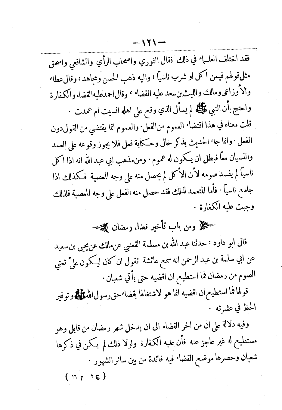 قال أبو داود: حدثنا عبد الله بن مسلمة القعنبي عن مالك عن يحيى بن سعيد، عَن أبي سلمة بن عبد الرحمن أنه سمع عائشة تقول إن كان ليكون عليّ تعني الصوم من رمضان فما استطيع أن أقضيه حتى يأتي شعبان.