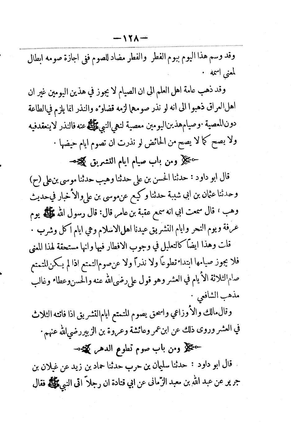 قال أبو داود: حدثنا الحسن بن علي حدثنا وهيب حدثنا موسى بن علي (ح) وحدثنا عثمان بن أبي شيبة حدثنا وكيع عن موسى بن علي والأخبار في حديث وهب، قال سمعت أبي أنه سمع عقبة بن عامر قال: قال رسول الله صلى الله عليه وسلم يوم عرفة ويوم النحر وأيام التشريق عيدنا أهل الاسلام وهي أيام أكل وشرب.