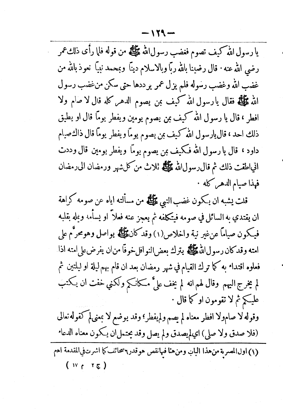 قلت يشبه أن يكون غضب النبي صلى الله عليه وسلم من مسألته إياه عن صومه كراهة أن يقتدي به السائل في صومه فيتكلفه ثم يعجز عنه فعلا أو يسأمه ويمله بقلبه فيكون صياما عن غير نية وإخلاص وقد كان صلى الله عليه وسلم يواصل وهو محرَّم على أمته وقد كان رسول الله صلى الله عليه وسلم يترك بعض النوافل خوفا من أن يفرض على أمته إذا فعلوه اقتداء به كما ترك القيام في شهر رمضان بعد أن قام بهم ليلة أو ليلتين ثم لم يخرح إليهم وقال لهم إنه لم يخف علي مكانكم ولكني خفت أن يكتب عليكم ثم لا تقومون أو كما قال.