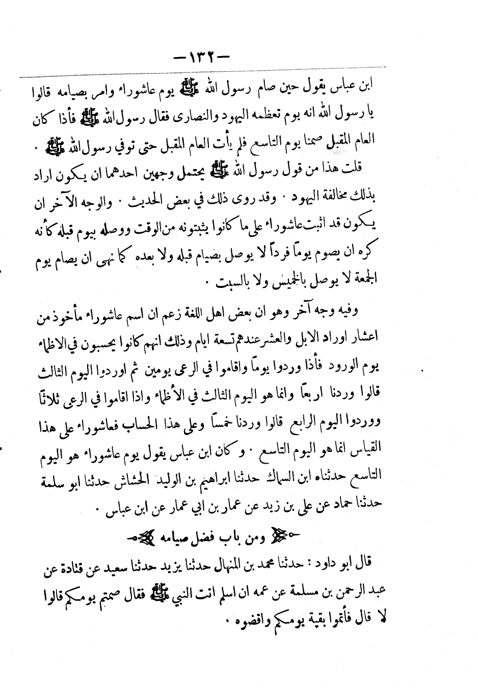 وفيه وجه آخر وهو أن بعض أهل اللغة زعم أن اسم عاشوراء مأخوذ من أعشار أوراد الإبل والعشر عندهم تسعة أيام وذلك أنهم كانوا يحسبون في الإظماء يوم الورود فإذا وردوا يوما وأقاموا في الرعي يومين ثم أوردوا اليوم الثالث قالوا وردنا أربعا وإنما هو اليوم الثالث في الإظماء وإذا أقاموا في الرعي ثلاثا ووردوا اليوم الرابع قالوا وردنا خمسا وعلى هذا الحساب فعاشوراء على هذا القياس إنما هو اليوم اتاسع. وكان ابن عباس يقول يوم عاشوراء هو اليوم التاسع حدثناه ابن السماك حدثنا إبراهيم بن الوليد الحشاش حدثنا أبو سلمة حدثنا حماد عن علي بن زيد عن عمار بن أبي عمار عن ابن عباس.