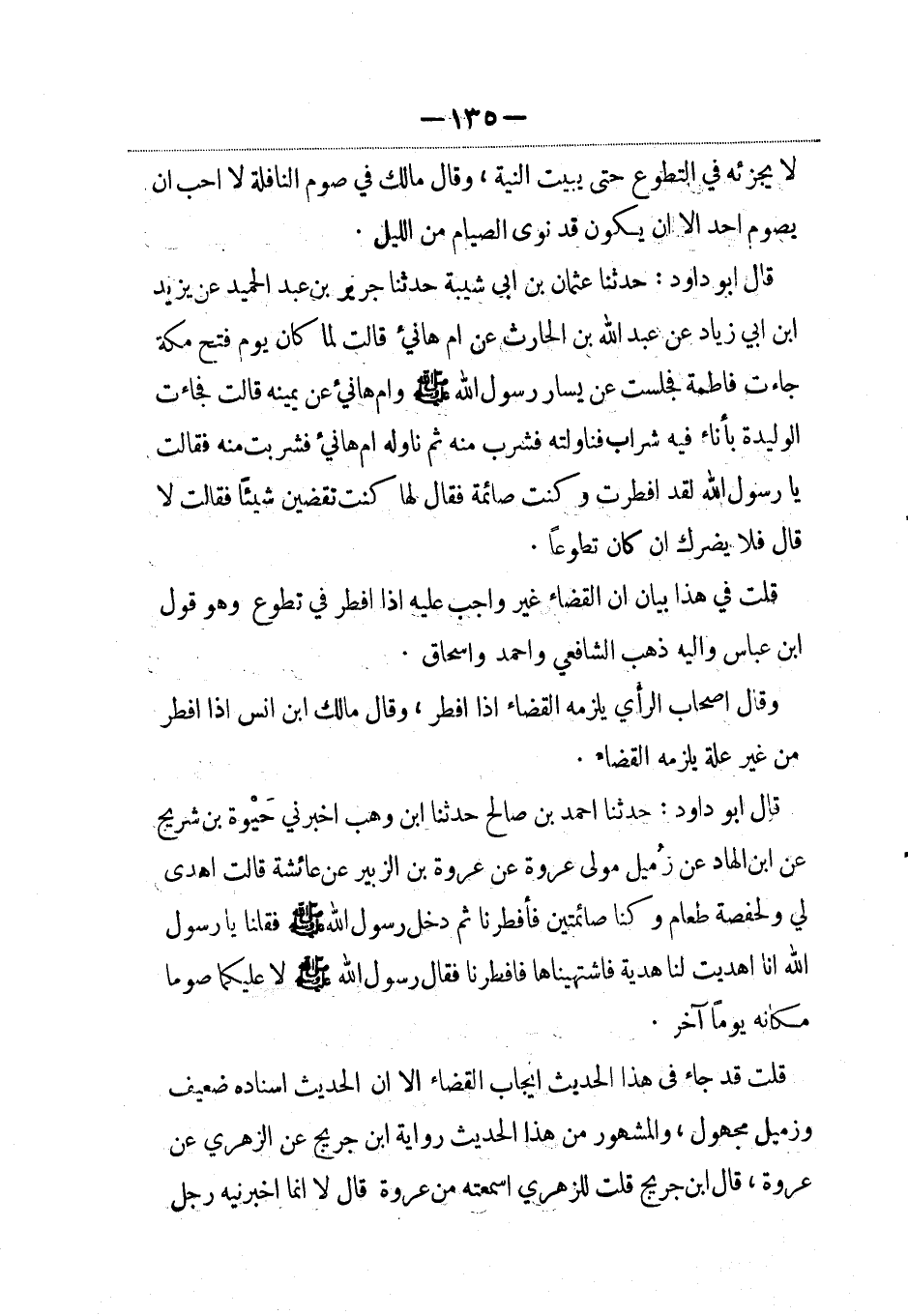قال أبو داود: حدثنا عثمان بن أبي شيبة حدثنا جرير بن عبد الحميد عن يزيد بن أبي زياد عن عبد الله بن الحارث عن أم هانىء قالت لما كان يوم فتح مكة جاءت فاطمة فجلست عن يسار رسول الله صلى الله عليه وسلم وأم هانىء عن يمينه قالت فجاءت الوليدة بإناء فيه شراب فناولته فشرب منه ثم ناوله أم هانىء فشربت منه فقالت يا رسول الله لقد أفطرت وكنت صائمة فقال لها كنت تقضين شيئا فقالت لا قال فلا يضرك إن كان تطوعا.