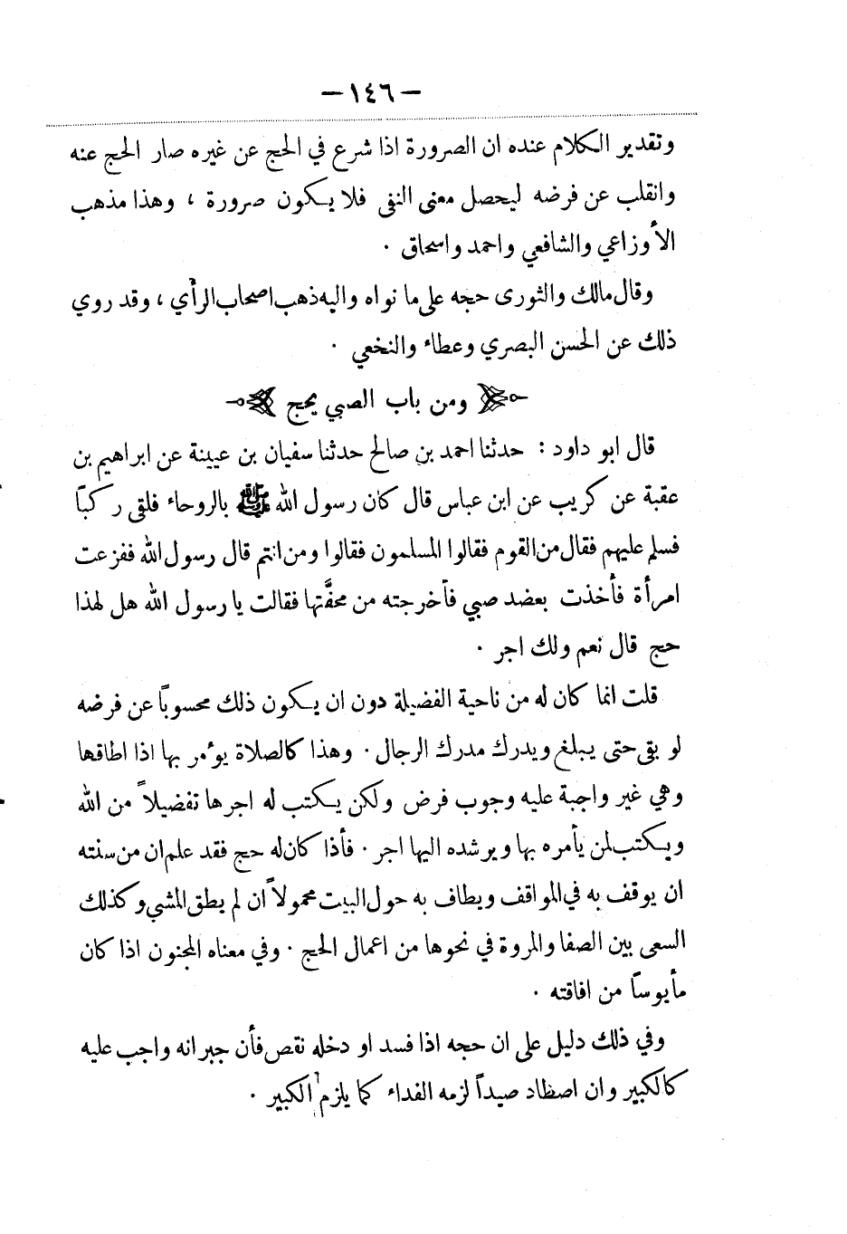 قال أبو داود: حدثنا أحمد بن صالح حدثنا سفيان بن عيينة عن إبراهيم بن عقبة عن كريب عن ابن عباس قال كان رسول الله صلى الله عليه وسلم بالروحاء فلقي ركباً فسلم عليهم فقال من القوم فقالوا المسلمون فقالوا ومن أنتم قال: رسول الله ففزعت امرأة فأخذت بعضد صبي فأخرجته من محفَّتها فقالت يا رسول الله هل لهذا حج قال نعم ولك أجر.