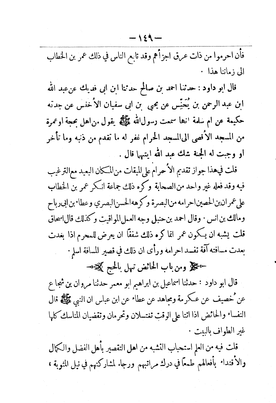 قال أبو داود: حدثنا أحمد بن صالح حدثنا ابن أبى فديك عن عبد الله بن عبد الرحمن بن يُحَنِّس عن يحيى بن أبي سفيان الأخنس عن جدته حكيمة عن أم سلمة أنها سمعت رسول الله صلى الله عليه وسلم يقول من أهل بحجة أو عمره من المسجد الأقصى إلى المسجد الحرام غفر له ما تقدم من ذنبه وما تأخر أو وجبت له الجنة شك عبد الله أيتهما قال.