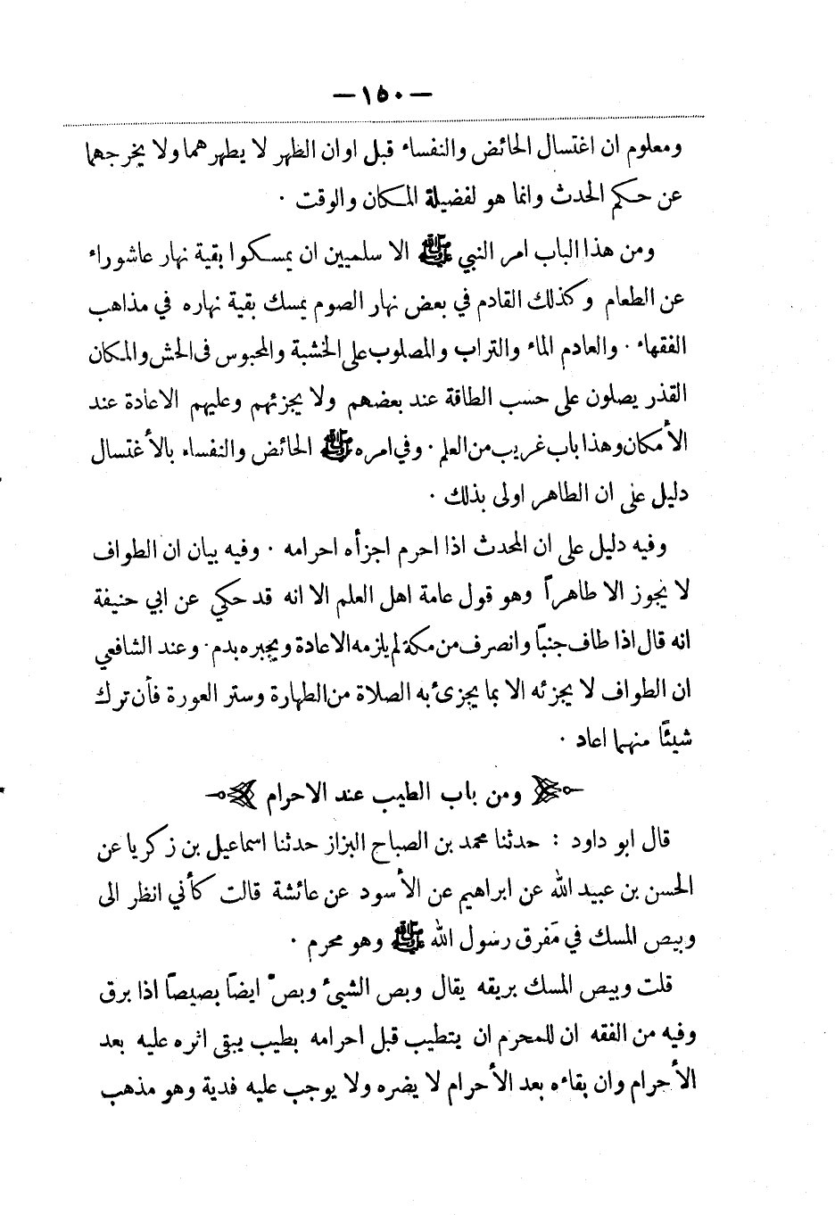 قال أبو داود: حدثنا محمد بن الصباح البزاز حدثنا إسماعيل بن زكريا عن الحسن بن عبيد الله عن إبراهيم عن الأسود عن عائشة قالت كأني أنظر إلى وبيص المسك في مفرق رسول الله صلى الله عليه وسلم وهو محرم.