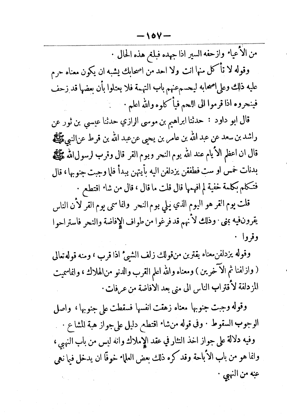 قال أبو داود: حدثنا إبراهيم بن موسى الرازي حدثنا عيسى بن ثور عن راشد بن سعد عن عبد الله بن عامر بن يحيى عن عبد الله بن قرط عن النبي صلى الله عليه وسلم قال إن أعظم الأيام عند الله يوم النحر ويوم القر قال وقرب لرسول الله صلى الله عليه وسلم بدنات خمس أو ست فطفقن يزدلفن إليه بأيتهن يبدأ فلما وجبت جنوبها، قال فتكلم بكلمة خفية لم أفهمها قال قلت ما قال، قال من شاء اقتطع.