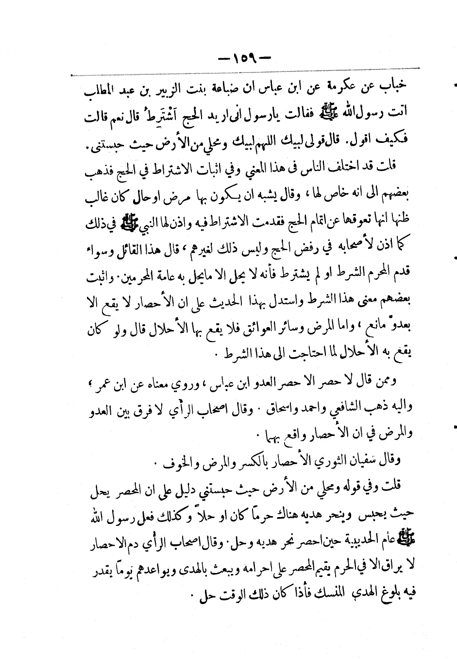 خباب عن عكرمة عن ابن عباس أن ضباعة بنت الزبير بن عبد المطلب أتت رسول الله صلى الله عليه وسلم فقالت يا رسول الله إني أريد الحج أَشتَرِطُ قال نعم قالت فكيف أقول. قال قولي لبيك اللهم لبيك ومحلي من الأرض حيث حبستني.