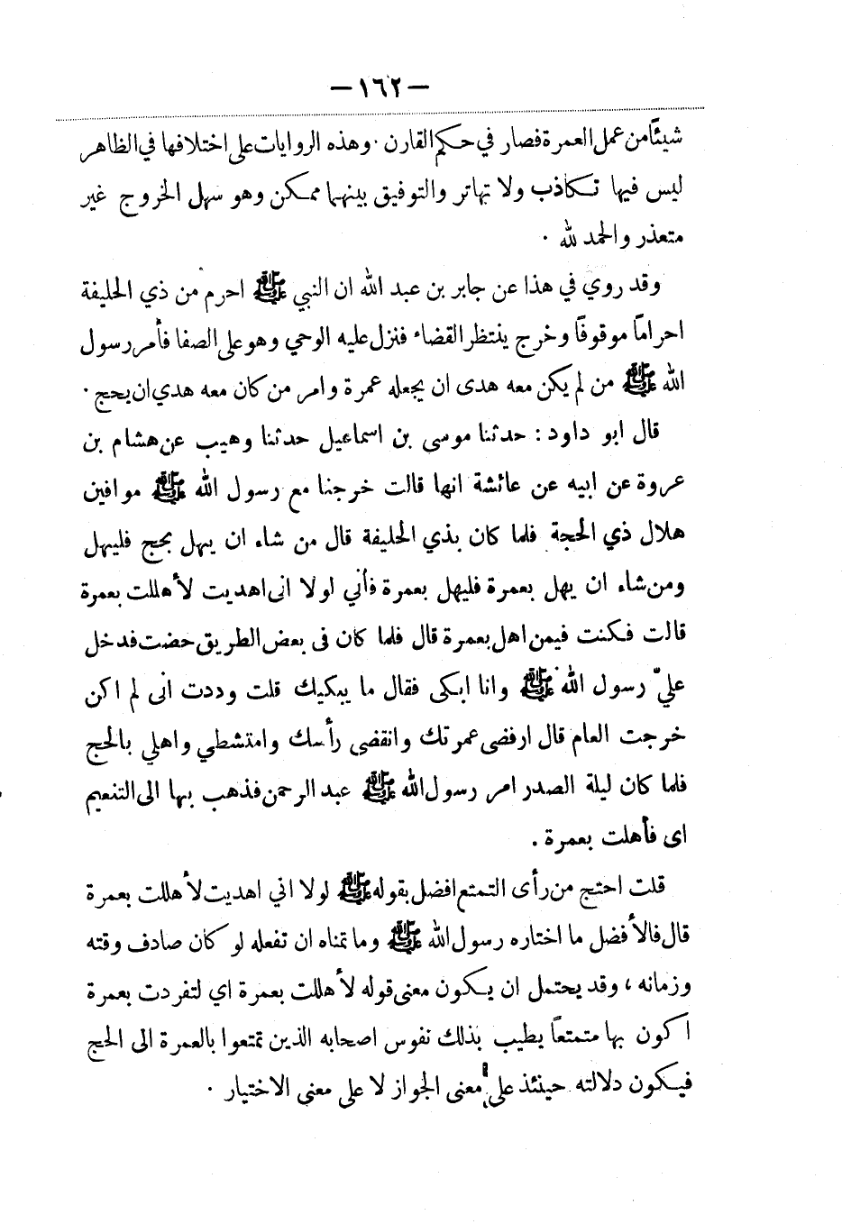 قال أبو داود: حدثنا موسى بن إسماعيل حدثنا وهيب عن هشام بن عروه عن أبيه عن عائشة أنها قالت خرجنا مع رسول الله صلى الله عليه وسلم موافين هلال ذي الحجة فلما كان بذي الحليفة قال من شاء أن يهل بحج فليهل ومن شاء أن يهل بعمرة فليهل بعمرة فإني لولا أني أهديت لأهللت بعمرة قالت فكنت فيمن أهل بعمرة قال فلما كان في بعض الطريق حضت فدخل علي رسول الله صلى الله عليه وسلم وأنا أبكي فقال ما يبكيك قلت وددت أني لم أكن خرجت العام قال ارفضي عمرتك وانقضي رأسك وامتشطي وأهلي بالحج فلما كان ليلة الصدر أمر رسول الله صلى الله عليه وسلم عبد الرحمن فذهب بها إلى التنعيم أي فأهلت بعمرة.