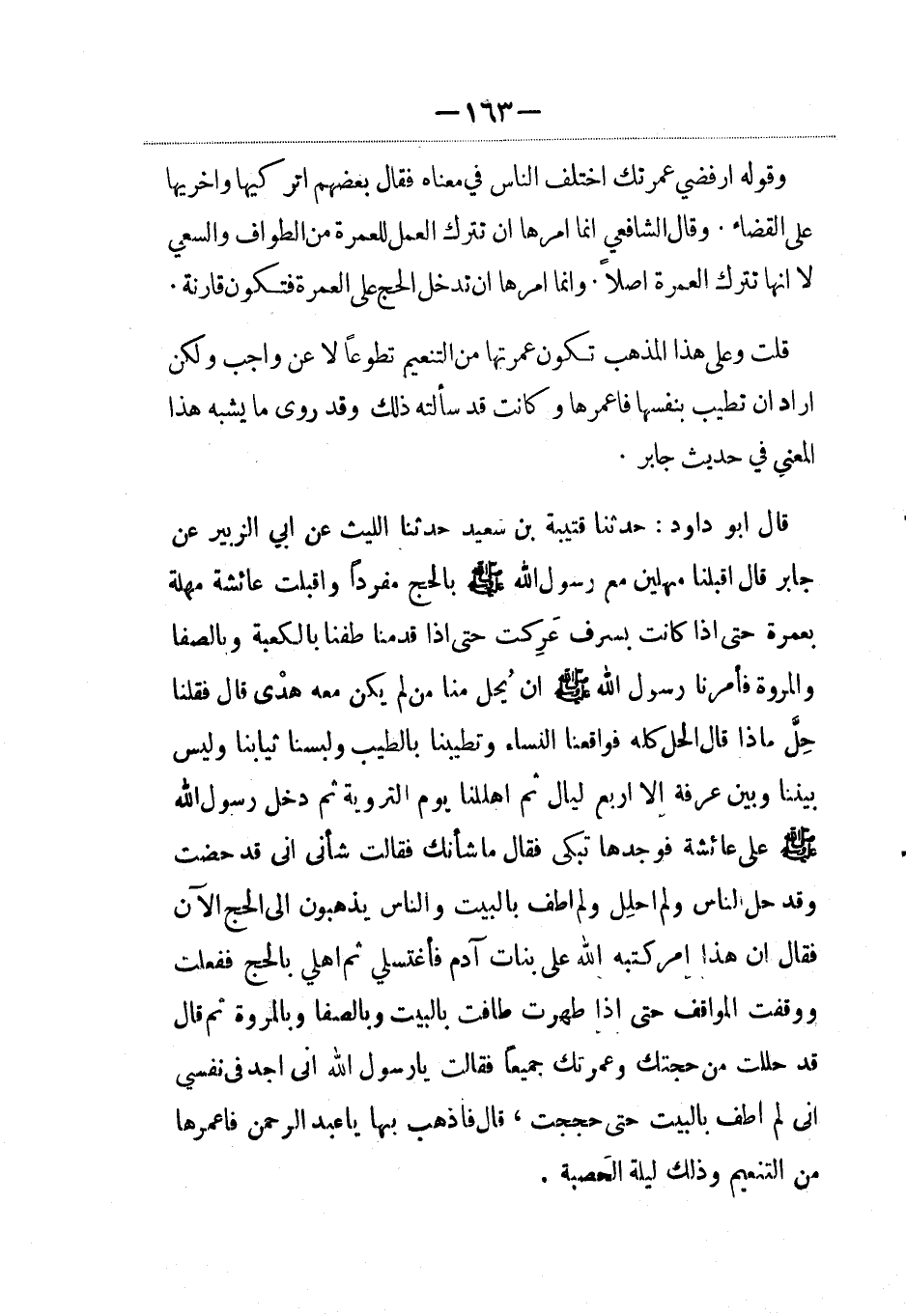 قال أبو داود: حدثنا قتيبة بن سعيد حدثنا الليث، عَن أبي الزبير عن جابر قال أقبلنا مهلين مع رسول الله صلى الله عليه وسلم بالحج مفردا وأقبلت عائشة مهلة بعمرة حتى إذا كانت بسرف عَرِكت حتى إذا قدمنا طفنا بالكعبة وبالصفا والمروة فأمرنا رسول الله صلى الله عليه وسلم أن يحل منا من لم يكن معه هدي قال فقلنا حِلَّ ماذا قال الحل كله فواقعنا النساء وتطيبنا بالطيب ولبسنا ثيابنا وليس بيننا وبين عرفة إلاّ أربع ليال ثم أهللنا يوم التروية ثم دخل رسول الله صلى الله عليه وسلم على عائشة فوجدها تبكي فقال ما شأنك فقالت شأني أني قد حضت وقد حل الناس ولم أحلل ولم أطف بالبيت والناس يذهبون إلى الحج الآن فقال إن هذا أمر كتبه الله على بنات آدم فاغتسلي ثم أهلي بالحج ففعلت ووقفت المواقف حتى إذا طهرت طافت بالبيت وبالصفا وبالمروة ثم قال قد حللت من حجتك وعمرتك جميعا فقالت يا رسول الله إني أجد في نفسي أني لم أطف بالبيت حتى حججت، قال فاذهب بها عبد الرحمن فاعمرها من التنعيم وذلك ليلة الحَصبة.
