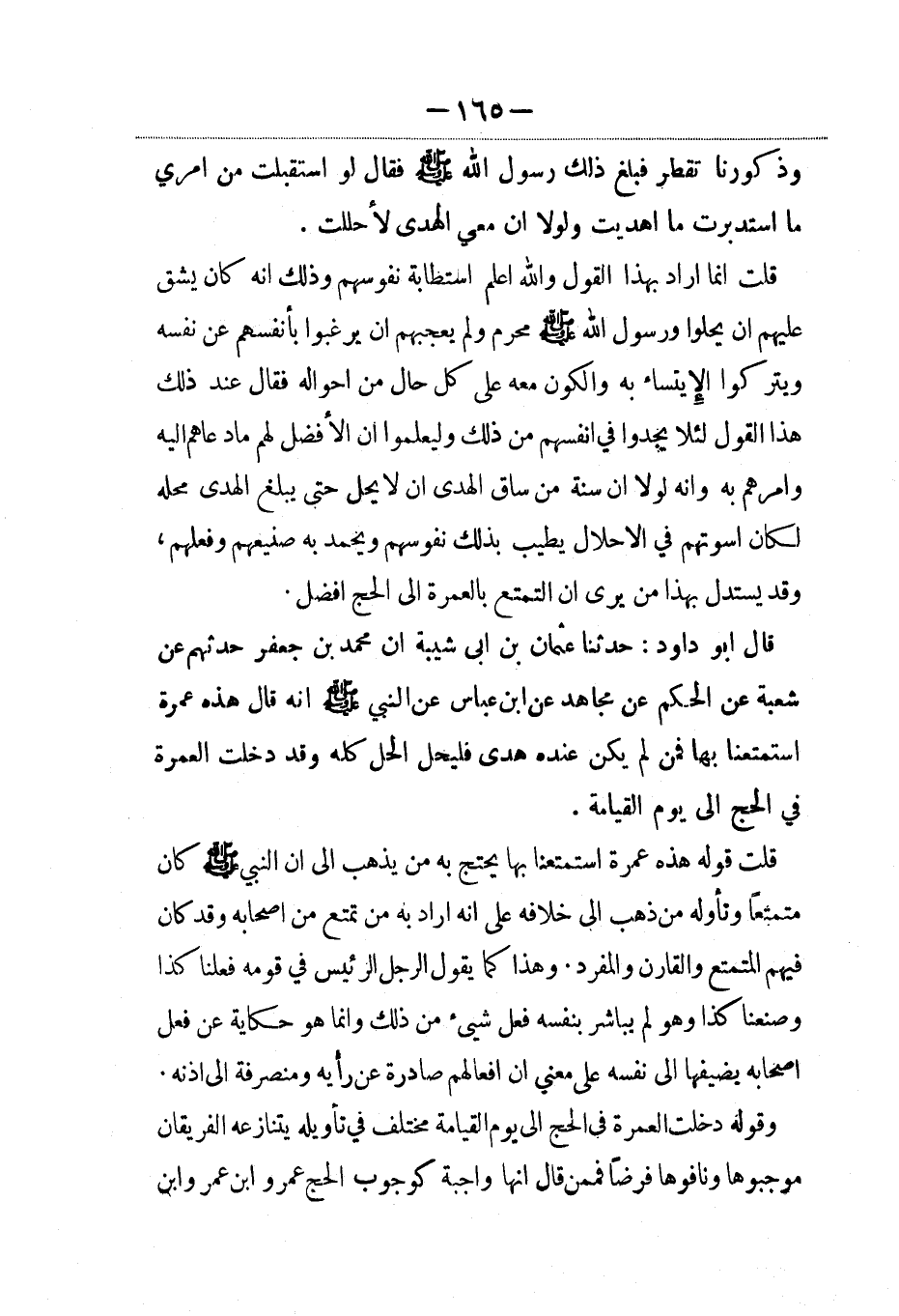 قال أبو داود: حدثنا عثمان بن أبي شيبة أن محمد بن جعفر حدثهم عن شعبة عن الحكم عن مجاهد عن ابن عباس عن النبي صلى الله عليه وسلم أنه قال هذه عمرة استمتعنا بها فمن لم يكن عنده هدي فليحل الحل كله وقد دخلت العمرة في الحج إلى يوم القيامة.