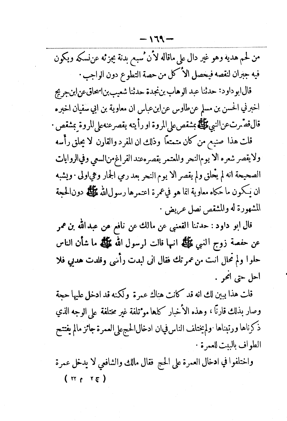 قال أبو داود: حدثنا القعنبي عن مالك عن نافع عن عبد الله بن عمر عن حفصة زوج النبي صلى الله عليه وسلم أنها قالت لرسول الله صلى الله عليه وسلم ما شأن الناس حلوا ولم تحلل أنت من عمرتك فقال إني لبدت رأسى وقلدت هديي فلا أحل حتى أنحر.