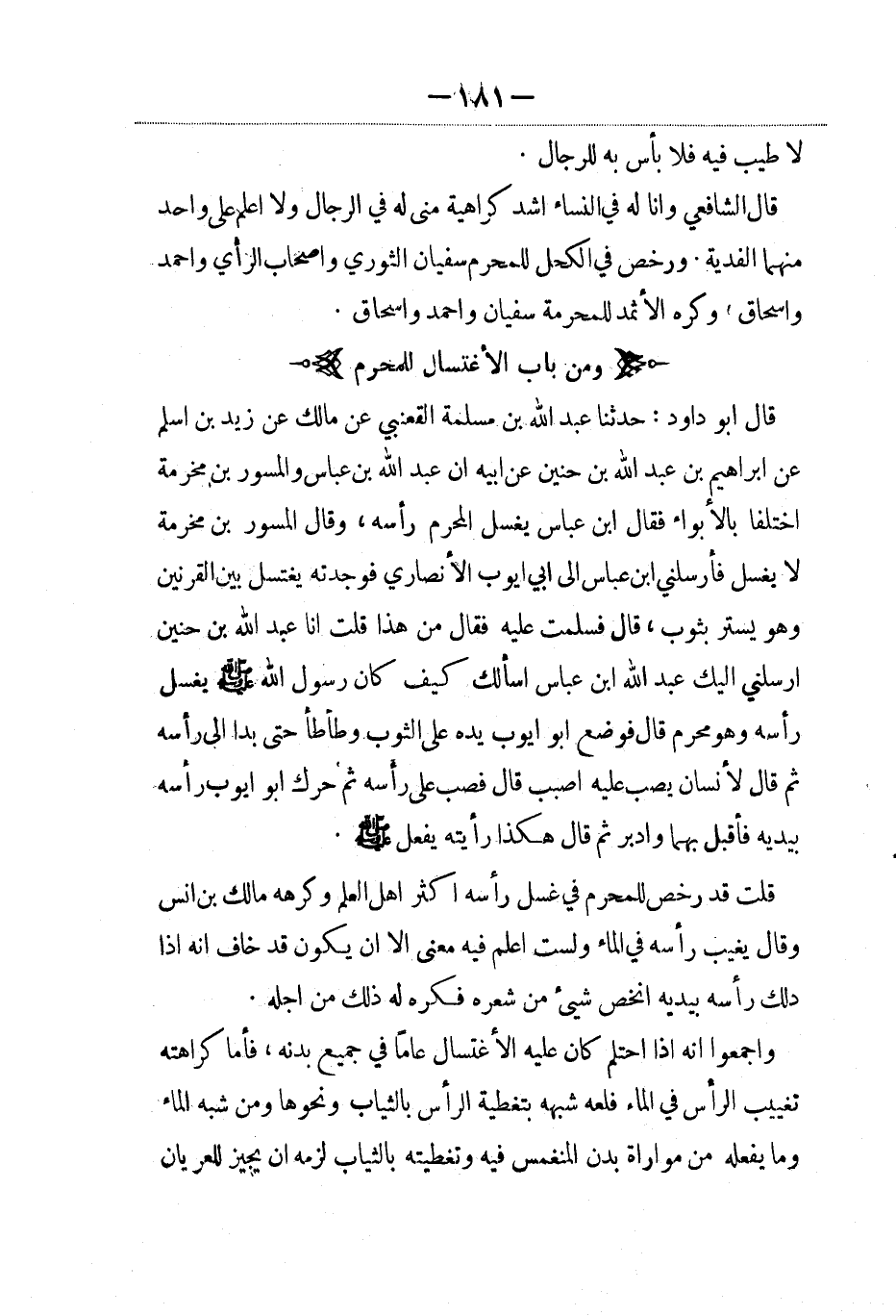 قال أبو داود: حدثنا عبد الله بن مسلمة القعنبي عن مالك عن زيد بن أسلم عن إبراهيم بن عبد الله بن حنين عن أبيه أن عبد الله بن عباس والمسور بن مخرمة اختلفا بالأبواء فقال ابن عباس يغسل المحرم رأسه، وقال المسور بن مخرمة لا يغسل فأرسلني ابن عباس إلى أبي أيوب الأنصاري فوجدته يغتسل بين القرنين وهو يستر بثوب، قال فسلمت عليه فقال من هذا قلت أنا عبد الله بن حنين أرسلني إليك عبد الله بن عباس أسألك كيف كان رسول الله صلى الله عليه وسلم يغسل رأسه وهو محرم قال فوضع أبو أيوب يده على الثوب وطأطأ حتى بدا إلي رأسه ثم قال لإنسان يصب عليه أصبب قال فصب على رأسه ثم حرك أبو أيوب رأسه بيديه فأقبل بهما وأدبر ثم قال هكذا رأيته يفعل صلى الله عليه وسلم.