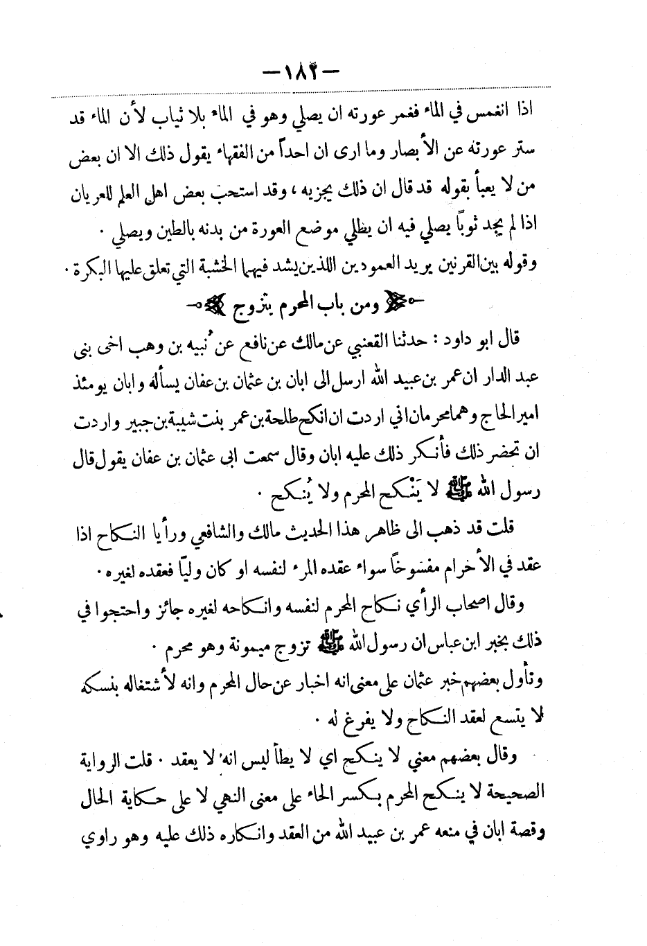 قال أبو داود: حدثنا القعنبي عن مالك عن نافع عن نبيه بن وهب أخي بني عبد الدار أن عمر بن عبيد الله أرسل إلى إبان بن عثمان يسأله وإبان يومئذ أمير الحاج وهما محرمان إني أردت أن أنكح طلحة بن عمر بنت شيبة بن جبير وأردت أن تحضر ذلك فأنكر ذلك عليه إبان وقال سمعت أبي عثمان بن عفان يقول قال رسول الله صلى الله عليه وسلم لا ينكح المحرم ولا ينكح.