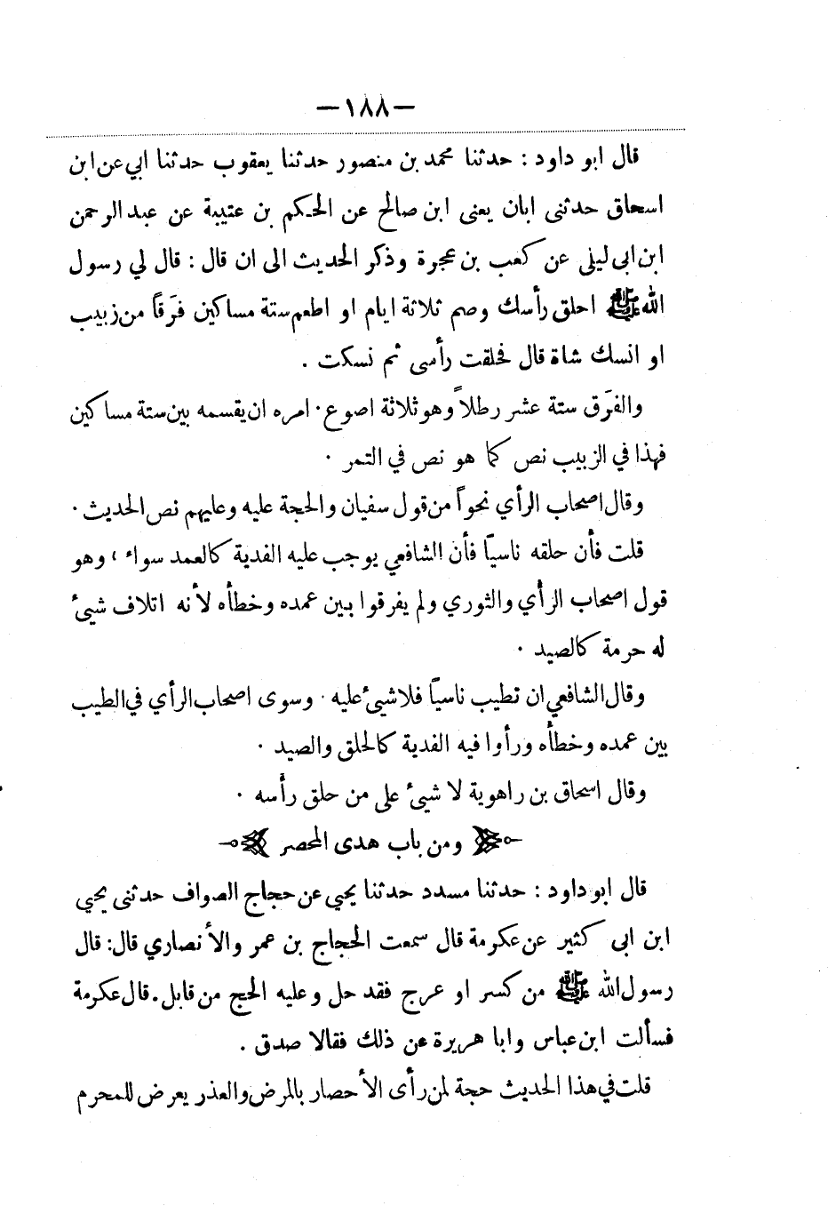 قال أبو داود: حدثنا محمد بن منصور حدثنا يعقوب حدثنا أبي عن ابن إسحاق حدثني أمان، يَعني ابن صالح عن الحكم بن عتيبة عن عبد الرحمن بن أبي ليلى عن كعب بن عجرة وذكر الحديث إلى أن قال: قال لي رسول الله صلى الله عليه وسلم أحلق رأسك وصم ثلاثة أيام أو أطعم ستة مساكين فرقا من زبيب أو أنسك شاة قال فحلقت رأسي ثم نسكت.