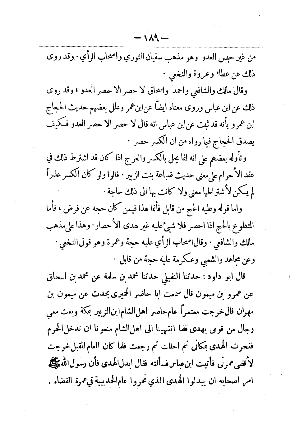 وقال مالك والشافعي وأحمد واسحاق لا حصر إلاّ حصر العدو، وقد روى ذلك عن ابن عباس وروي معناه أيضاً عن ابن عمر وعلل بعضهم حديث الحجاج بن عمرو بأنه قد ثبت عن ابن عباس أنه قال لا حصر إلاّ حصر العدو فكيف يصدق الحجاج فيما رواه من أن الكسر حصر.