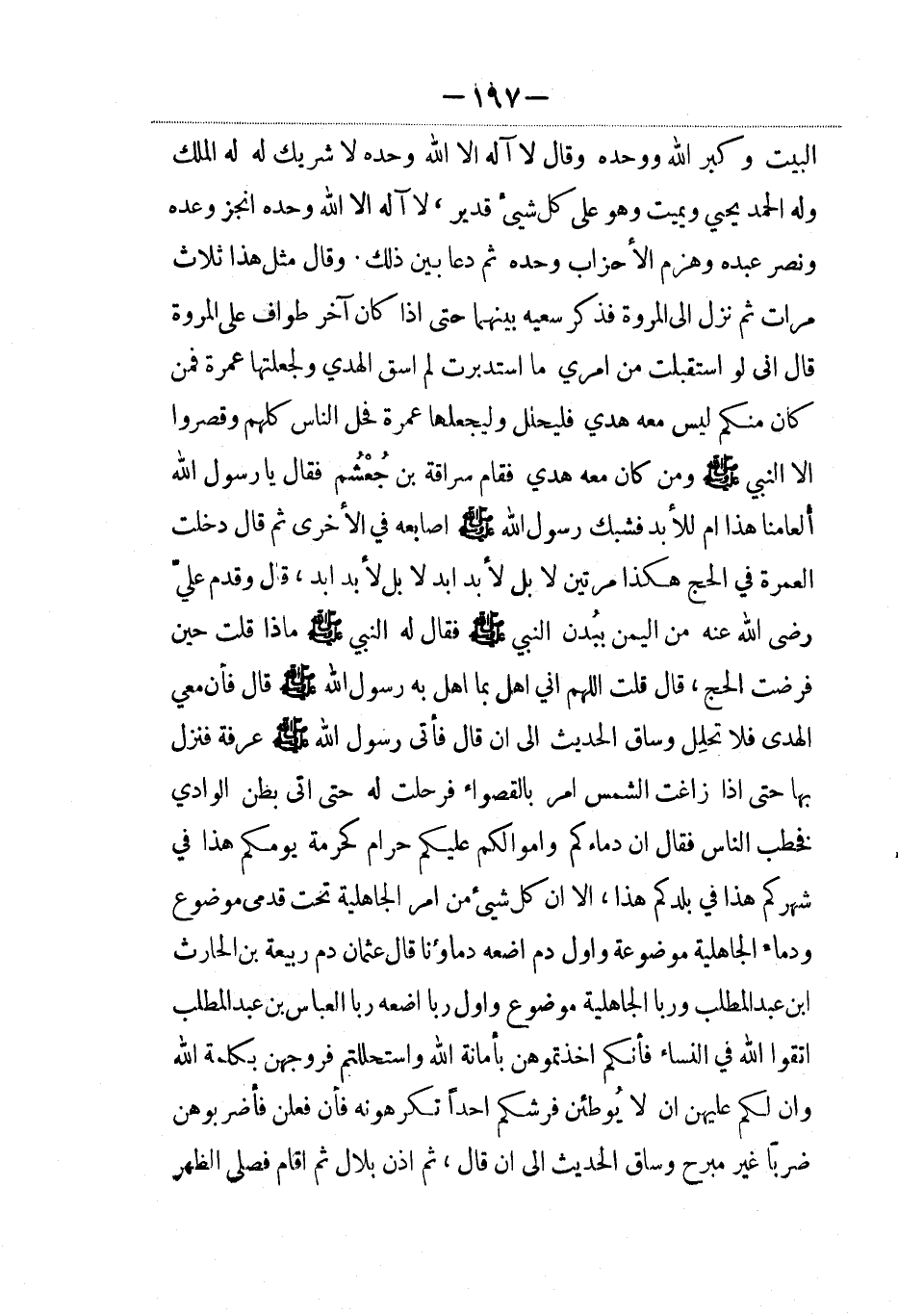 لا إله إلاّ الله وحده أنجز وعده ونصر عبده وهزم الأحزاب وحده ثم دعا بين ذلك. وقال مثل هذا ثلاث مرات ثم نزل إلى المروة فذكر سعيه بينهما حتى إذا كان آخر طواف على المروة قال إني لو استقبلت من أمري ما استدبرت لم أسق الهدي ولجعلتها عمرة فمن كان منكم ليس معه هدي فليحلل وليجعلها عمرة فحل الناس كلهم وقصروا إلا النبي صلى الله عليه وسلم ومن كان معه هدي فقام سراقة بن جعشم فقال يا رسول الله ألعامنا هذا أم للأبد فشبك رسول الله صلى الله عليه وسلم أصابعه في الأخرى ثم قال دخلت العمرة في الحج هكذا مرتين لا بل لأبد أبد لا بل لأبد أبد، قال وقدم علي رضي الله عنه من اليمن ببدن النبي صلى الله عليه وسلم فقال له النبي صلى الله عليه وسلم ماذا قلت حين فرضت الحج، قال قلت اللهم إني أهل بما أهل به رسول الله صلى الله عليه وسلم قال فإن معي الهدي فلا تحلل وساق الحديث إلى أن قال فأتى رسول الله صلى الله عليه وسلم عرفة فنزل بها حتى إذا زاغت الشمس أمر بالقصواء فرحلت له حتى أتى بطن الوادي فخطب الناس فقال إن دماءكم وأموالكم عليكم حرام كحرمة يومكم هذا في شهركم هذا في بلدكم هذا، إلاّ أن كل شيء من أمرالجاهلية تحت قدمي موضوع ودماء الجاهلية موضوعة وأول دم أضعه دماؤنا قال عثمان دم ربيعة بن الحارث بن عبد المطلب وربا الجاهلية موضوع وأول ربا أضعه ربا العباس بن عبد المطلب اتقوا الله في النساء فإنكم أخذتموهن بأمانة الله واستحللتم فروجهن بكلمة الله وإن لكم عليهن ان لا يوطئن فرشكم أحدا تكرهونه فإن فعلن فاضربوهن ضربا غير مبرح