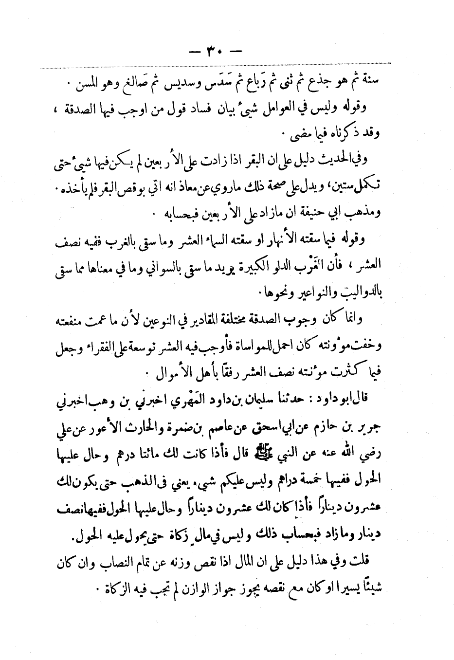 قال أبو داود: حدثنا سليمان بن داود المَهْري أخبرني ابن وهب أخبرني جرير بن حازم، عَن أبي إسحاق عن عاصم بن ضمرة والحارث الأعور عن علي رضي الله عنه عن النبي صلى الله عليه وسلم قال فإذا كانت لك مائتا درهم وحال عليها الحول ففيها خمسة دراهم وليس عليكم شيء، يَعني في الذهب حتى يكون لك عشرون دينارا فإذا كان لك عشرون دينارا وحال عليها الحول ففيها نصف دينار وما زاد فبحساب ذلك وليس في مالٍ زكاة حتى يحول عليه الحول.