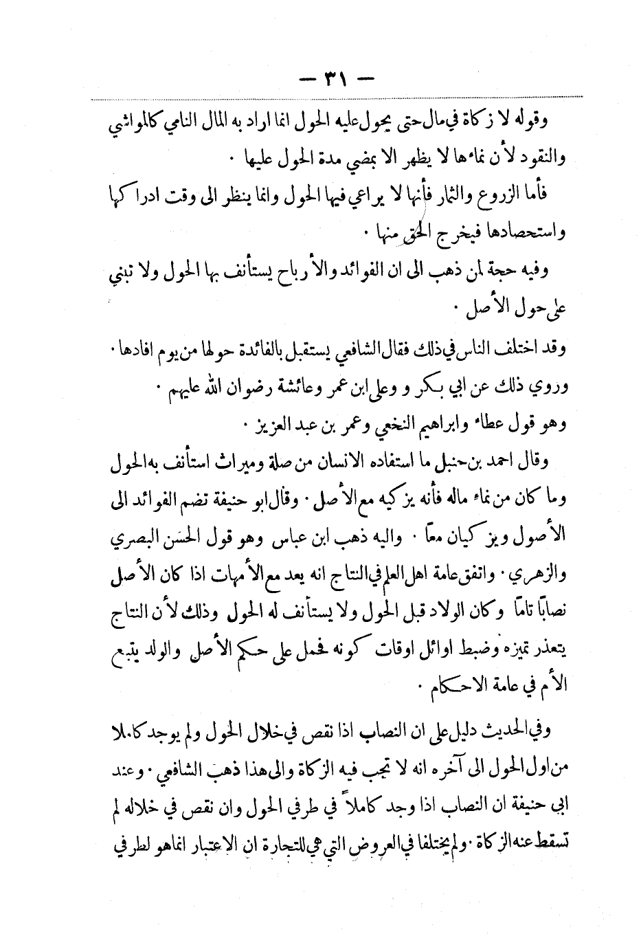 وقال أحمد بن حنبل ما استفاده الإنسان من صلة وميراث استأنف به الحول وما كان من نماء ماله فإنه يزكيه مع الأصل. وقال أبو حنيفة تضم الفوائد إلى الأصول ويزكيان معاً. وإليه ذهب ابن عباس وهو قول الحسن البصري والزهري. واتفق عامة أهل العلم في النتاج أنه يعد مع الأمهات إذا كان الأصل نصابا تاما وكان الولاد قبل الحول ولا يستأنف له الحول وذلك لأن النتاج يتعذر تميزه وضبط أوائل أوقات كونه فحمل على حكم الأصل والولد يتبع الأم في عامة الأحكام.