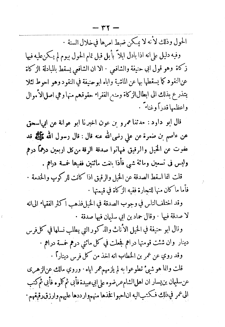 قال أبو داود: حدثنا عمرو بن عون أخبرنا أبو عَوانة، عَن أبي إسحاق عن عاصم بن ضمرة عن علي رضي الله عنه قال: قال رسول الله صلى الله عليه وسلم قد عفوت عن الخيل والرقيق فهاتوا صدقة الرقة من كل أربعين درهما درهم وليس في تسعين ومائة شيء فإذا بلغت مائتين ففييها خمسة دراهم.