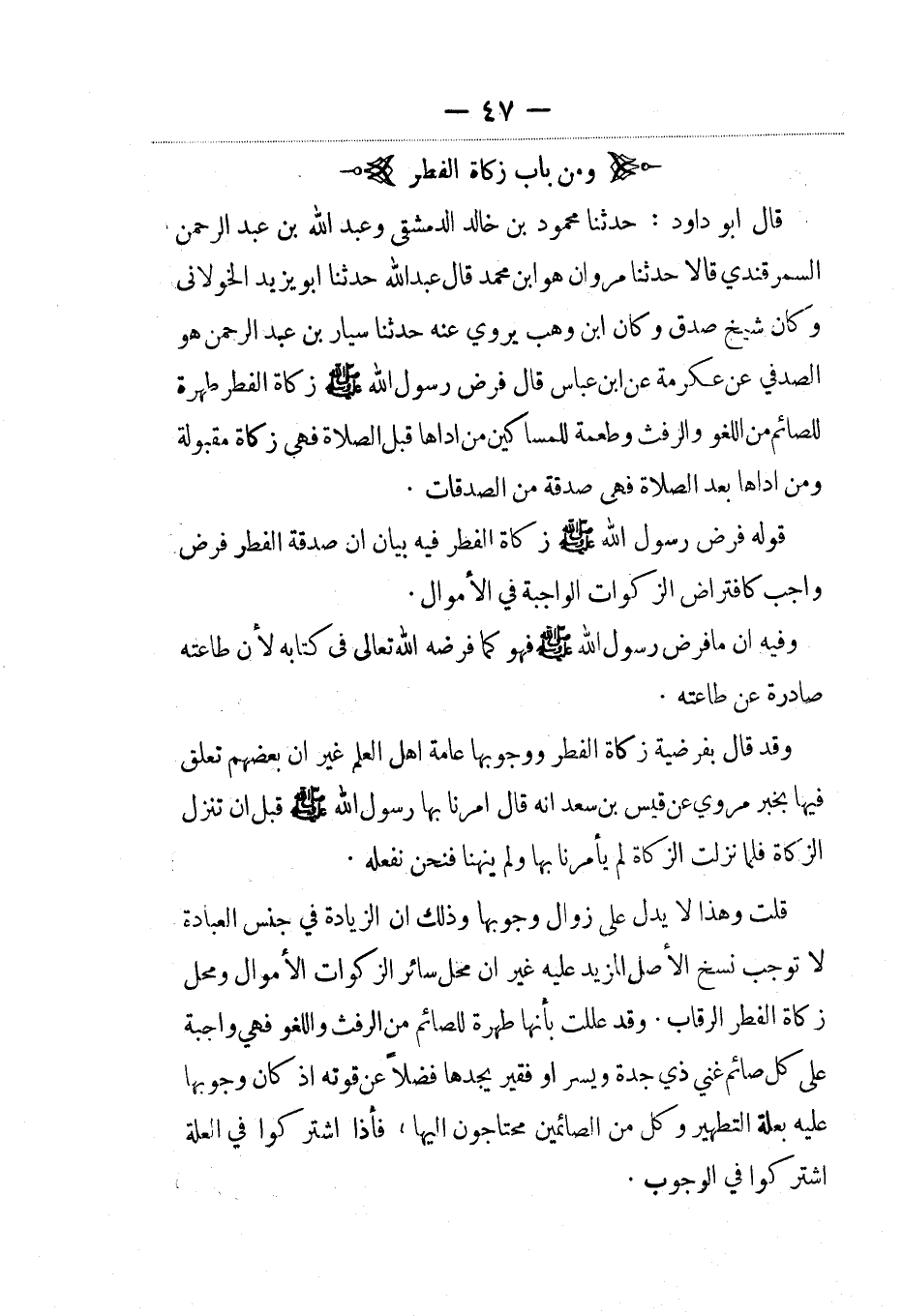 قال أبو داود: حدثنا محمود بن خالد الدمشقي وعبد الله بن عبد الرحمن السمرقندي قالا: حَدَّثنا مروان هو ابن محمد قال عبد الله حدثنا أبو يزيد الخولاني وكان شيخ صدق وكان ابن وهب يروي عنه حدثنا سيار بن عبد الرحمن هو الصدفي عن عكرمة عن ابن عباس قال فرض رسول الله صلى الله عليه وسلم زكاة الفطر طهرة للصائم من اللغو والرفث وطعمة للمساكين من أداها قبل الصلاة فهي زكاة مقبولة ومن أداها بعد الصلاة فهي صدقة من الصدقات.