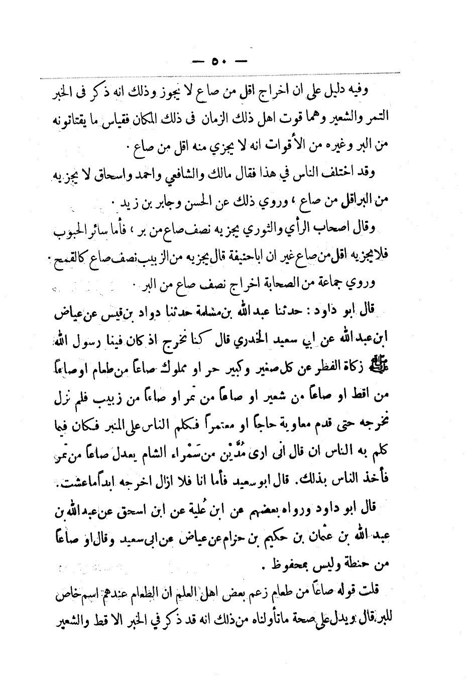قال أبو داود: حدثنا عبد الله بن مسلمة حدثنا داود بن قيس عن عياض بن عبد الله، عَن أبي سعيد الخدري قال: كنا نخرج إذ كان فينا رسول الله صلى الله عليه وسلم زكاة الفطر عن كل صغير وكبير حر أو مملوك صاعاً من طعام أو صاعا من أقط أو صاعا من شعير أو صاعا من تمر أو صاعا من زبيب فلم نزل نخرجه حتى قدم معاوية حاجا أومعتمرا فكلم الناس على المنبر فكان فيما كلم به الناس أن قال: إني أرى مُدَّين من سَمْراء الشام يعدل صاعا من تمر فأخذ الناس بذلك. قال أبو سعيد فأما أنا فلا أزال أخرجه أبدا ما عشت.