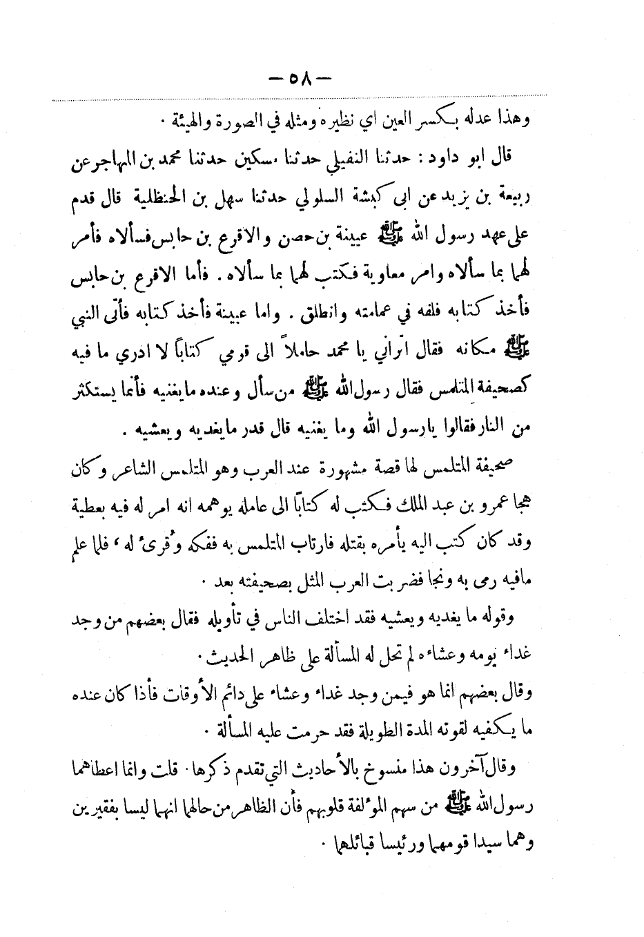 قال أبو داود: حدثنا النفيلي حدثنا مسكين حدثنا محمد بن المهاجر عن ربيعة بن يزيد، عَن أبي كبشة السلولي حدثنا سهل بن الحنظلية قال قدم على عهد رسول الله صلى الله عليه وسلم عيينة بن حصن والأقرع بن حابس فسألاه فأمر لهما بما سألاه وأمر معاوية فكتب لهما بما سألاه. فأما الأقرع بن حابس فأخذ كتابه فلفه في عمامته وانطلق. وأما عيينة فأخذ كتابه فأتى النبي صلى الله عليه وسلم مكانه فقال أتراني يا محمد حاملا إلى قومي كتابا لا أدري ما فيه كصحيفة المتلمس فقال رسول الله صلى الله عليه وسلم من سأل وعنده ما يغنيه فإنما يستكثر من النار فقالوا يا رسول الله وما يغنيه قال قدر ما يغديه ويعشيه.