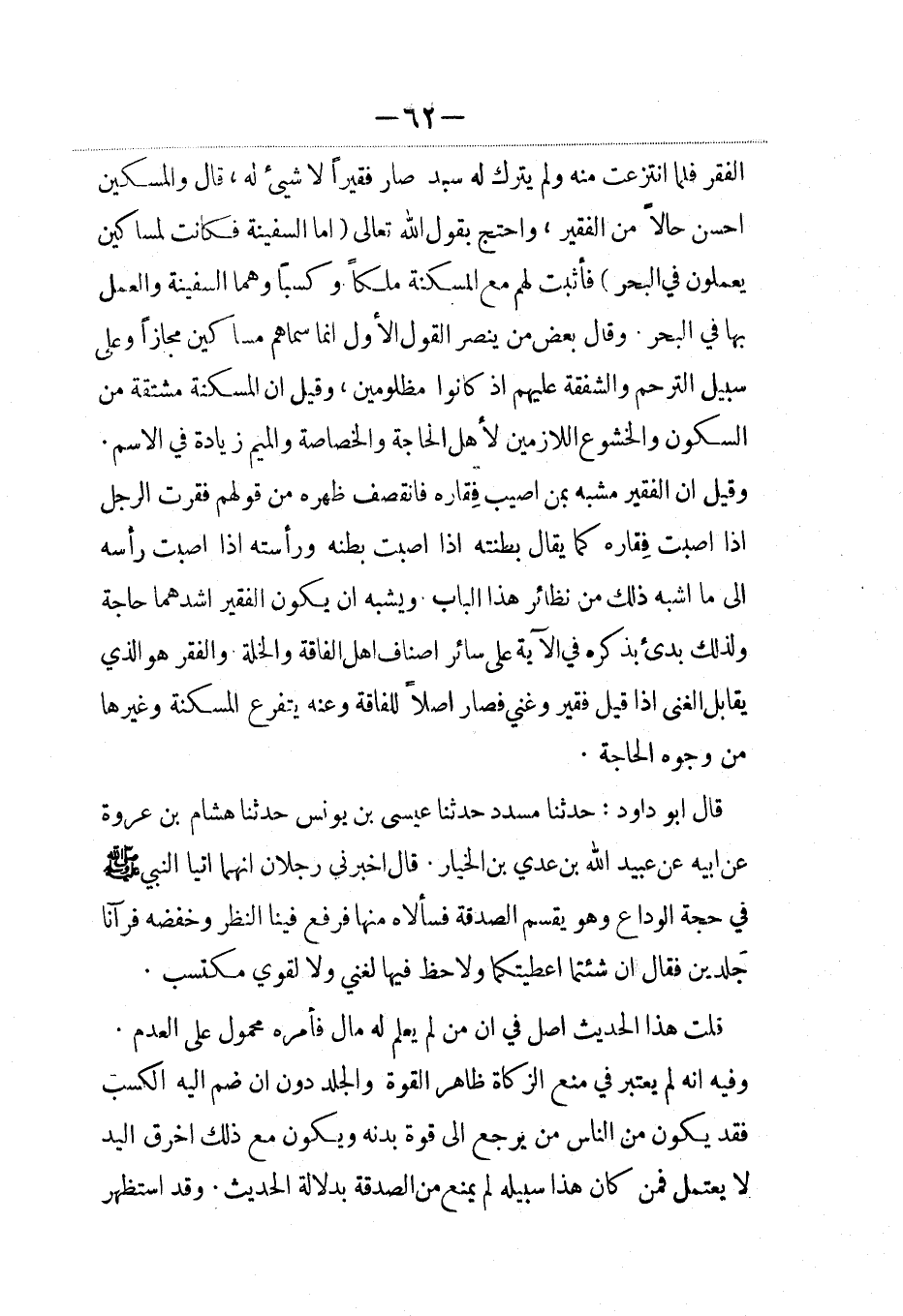 قال أبو داود: حدثنا مسدد حدثنا عيسى بن يونس حدثنا هشام بن عروة عن أبيه عن عبيد الله بن عدي بن الخيار. قال أخبرني رجلان أنهما أتيا النبي صلى الله عليه وسلم في حجة الوداع وهو يقسم الصدقة فسألاه منها فرفع فينا النظر وخفضه فرآنا جَلدين فقال إن شئتما أعطيتكما ولاحظ فيها لغني ولا لقوي مكتسب.