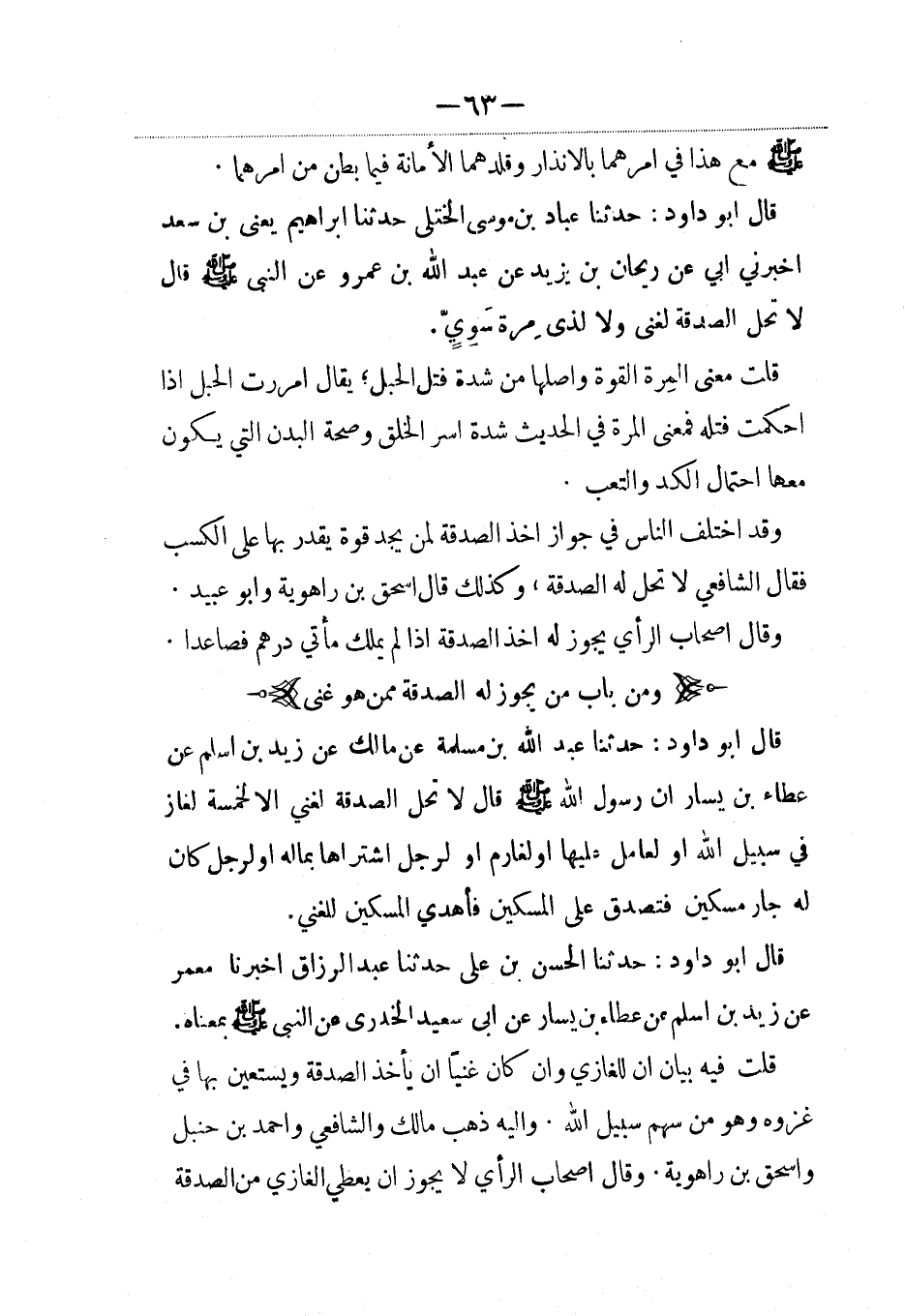 قال أبو داود: حدثنا عباد بن موسى الختلي حدثنا إبراهيم، يَعني ابن سعد أخبرني أبي عن ريحان بن يزيد عن عبد الله بن عمرو عن النبي صلى الله عليه وسلم قال: لا تحل الصدقة لغني ولا لذي مِرة سَوِي.