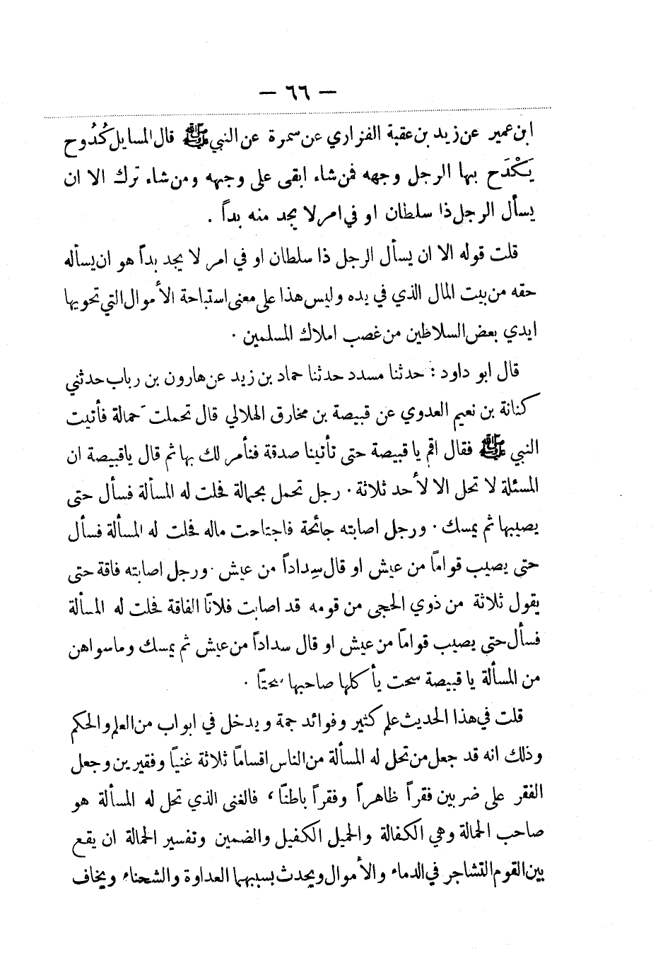 قال أبو داود: حدثنا مسدد حدثنا حماد بن زيد عن هارون بن رباب حدثني كنانة بن نعيم العدوي عن قبيصة بن مخارق الهلالي قال تحملت حمالة فأتيت النبي صلى الله عليه وسلم فقال: أقم يا قبيصة حتى تأتينا صدقه فنأمر لك بها ثم قال يا قبيصة إن المسألة لا تحل إلاّ لأحد ثلاثة رجل تحمل بحمالة فحلت له المسألة فسأل حتى يصيبها ثم يمسك. ورجل أصابته جائحة فاجتاحت ماله فحلت له المسألة فسأل حتى يصيب قواماً من عيش أو قال سدادا من عيش ورجل أصابته فاقة حتى يقول ثلاثة من ذوي الحجى من قومه قد أصابت فلانا الفاقة فحلت له المسألة فسأل حتى يصيب قواما من عيش أو قال سدادا من عيش ثم يمسك وما سواهن من المسألة يا قبيصة سحت يأكلها صاحبها سحتاً.