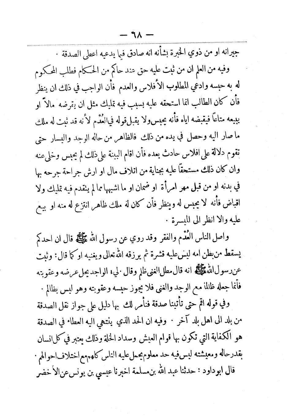 وفيه من العلم أن من ثبت عليه حق عند حاكم من الحكام فطلب المحكوم له به حبسه وادعى المطلوب الإفلاس والعدم فإن الواجب في ذلك أن ينظر فإن كان الطالب إنما استحقه عليه بسبب فيه تمليك مثل أن يقرضه مالا أو يبيعه متاعا فيقبضه إياه فإنه يحبس ولا يقبل قوله في العُدم لأنه قد ثبت له ملك ما صار إليه وحصل في يده من ذلك فالظاهر من حاله الوجد واليسار حتى تقوم دلالة على إفلاس حادث بعده فإن أقام البينة على ذلك لم يحبس وخلي عنه وإن كان ذلك مستحقا عليه بجناية من إتلاف مال أو أرش جراحة جرحه بها في بدنه أو من قبل مهر امرأة أو ضمان أوما أشبهها مما لم يتقدم فيه تمليك ولا إقباض فإنه لا يحبس له وينظر فإن كان له ملك ظاهر انتزع له منع أو بيع عليه وإلا أنظر إلى الميسرة.